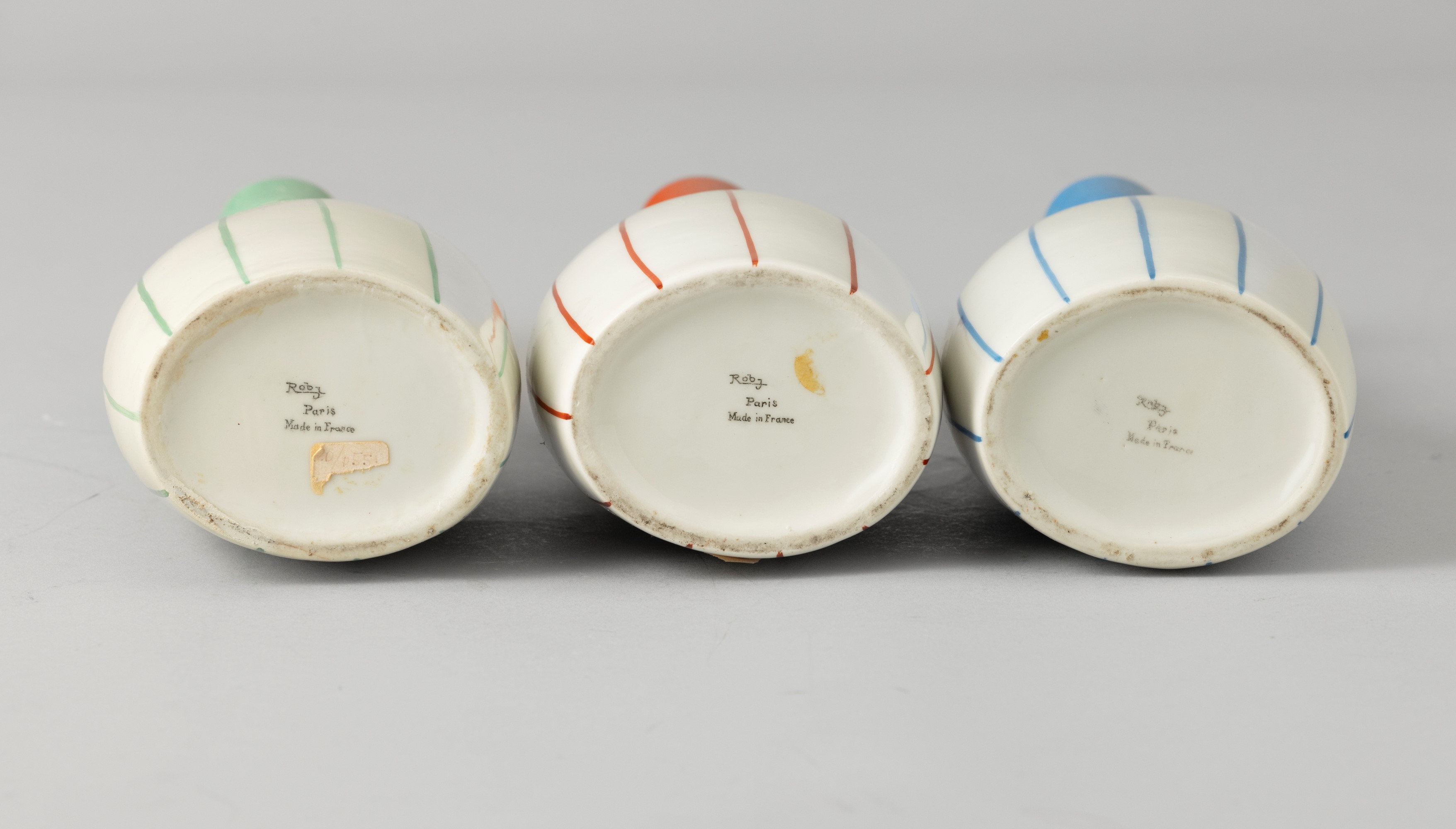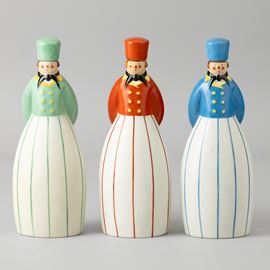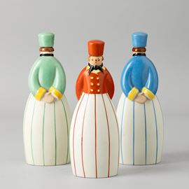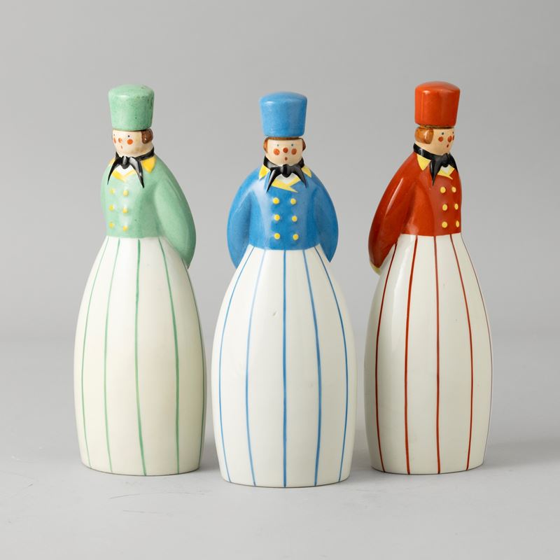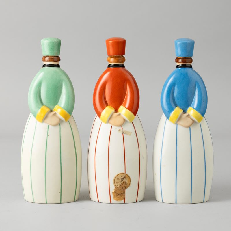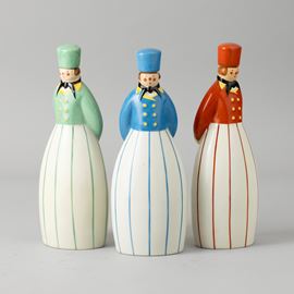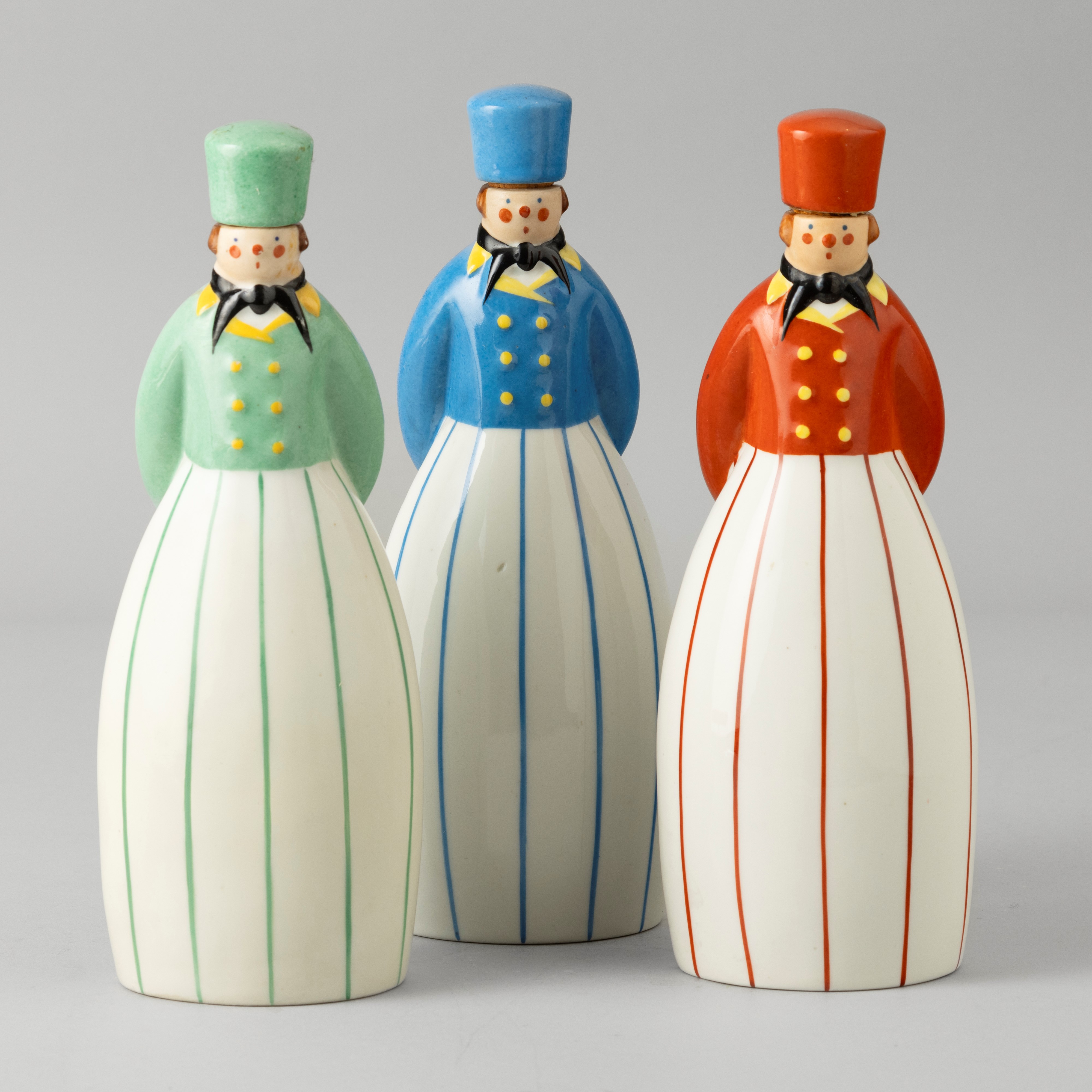 Tre bottiglie con tappo in forma di uomini in divisa con grande gonna in porcellana con decoro a smalti policromi.