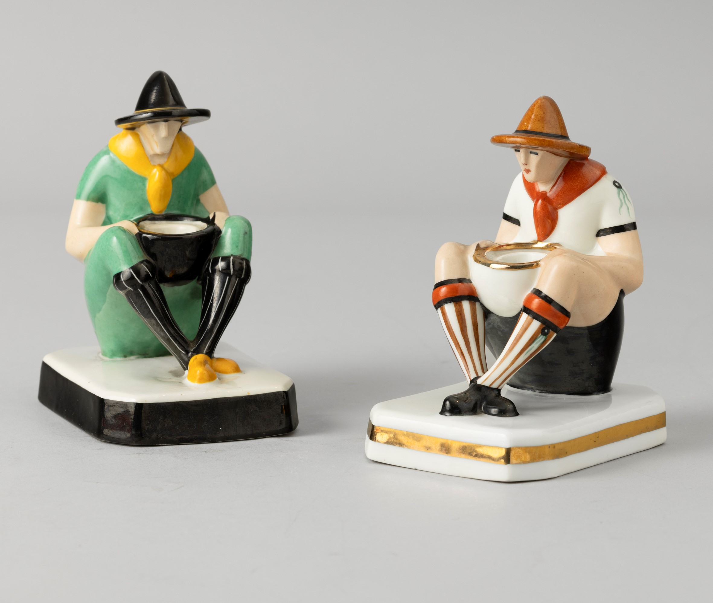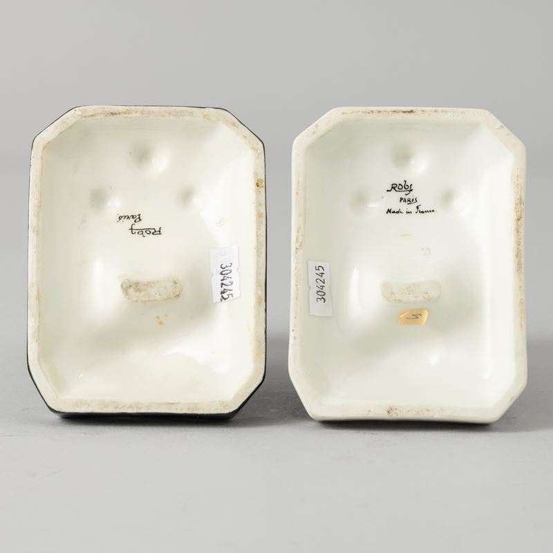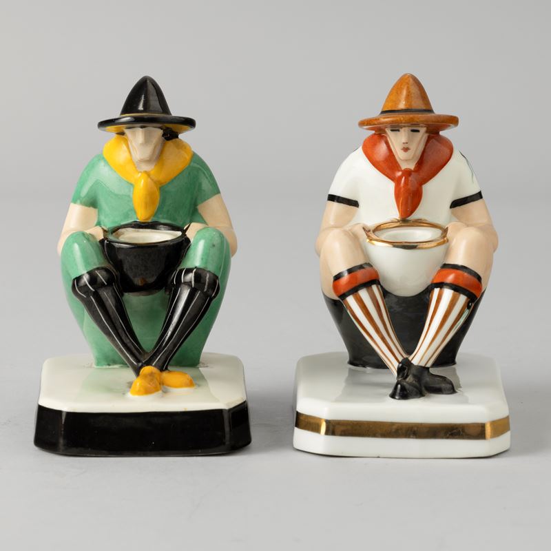 Due calamai in forma di contadino in porcellana con decoro a smalti policromi.