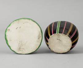 Coppia di scatole in porcellana in forma di damine con ventaglio e scialle con decoro a smalti policromi.