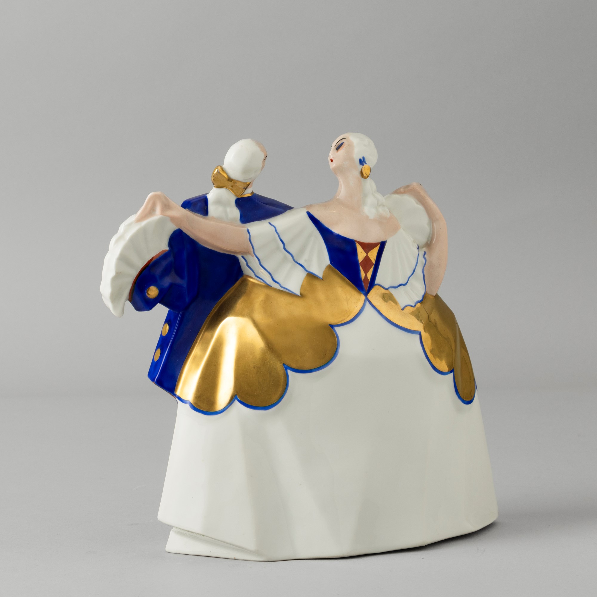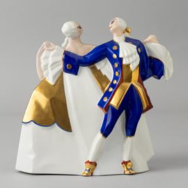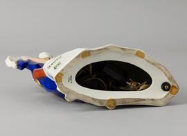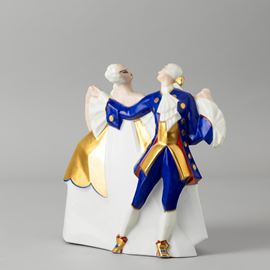 Grande veilleuse in porcellana in forma di danzatori in abiti settecenteschi con decoro a smalti policromi e dorature.