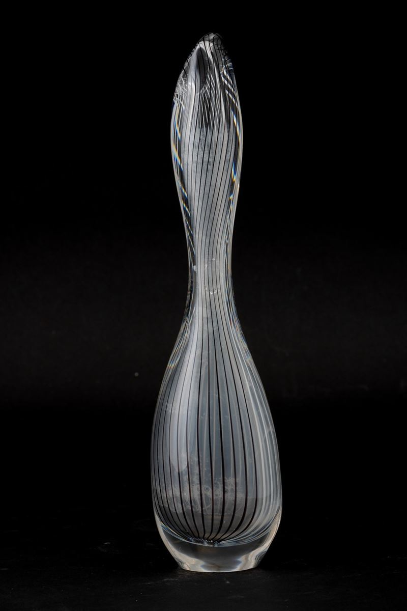 Vaso solifleur con strozzatura centrale in vetro con decoro di canne a due colori.