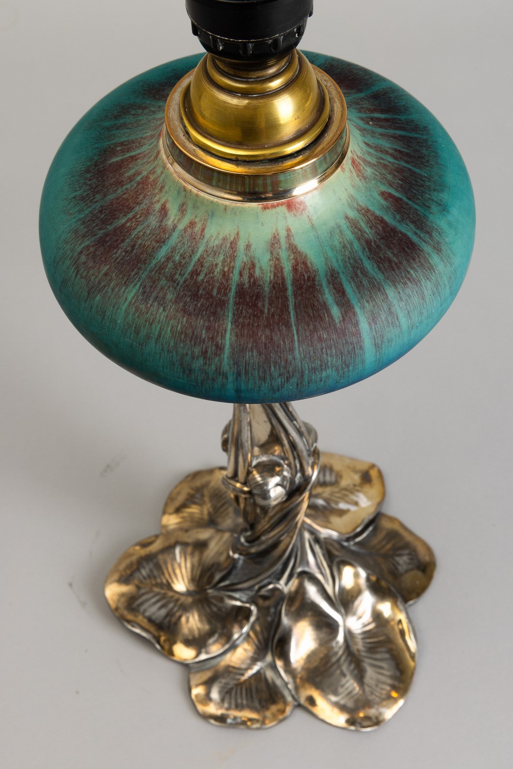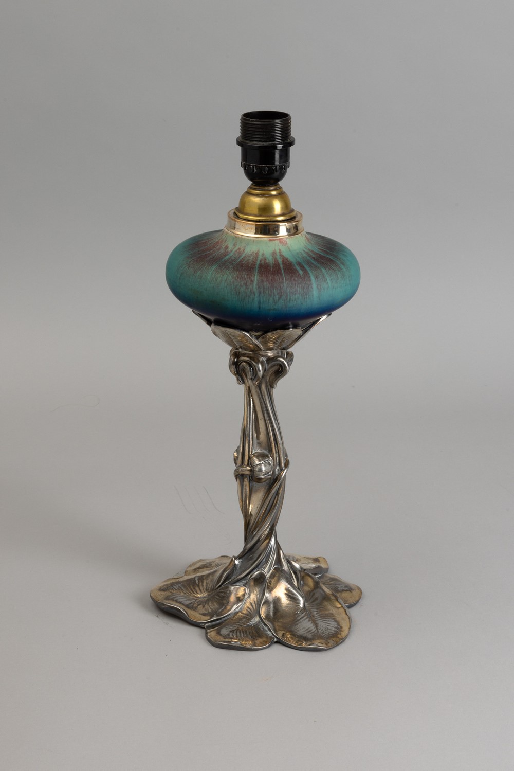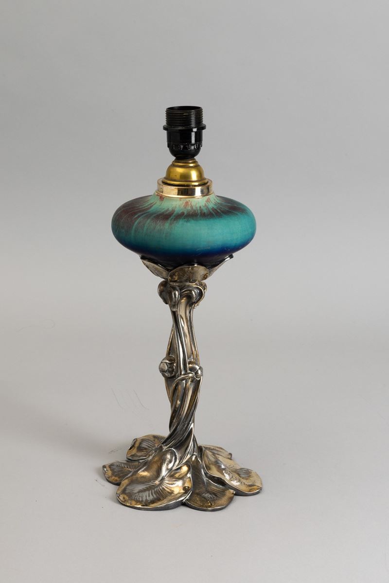 Lampada da tavolo con decoro astratto e busto in metallo argentato in foggia di fogliame.
