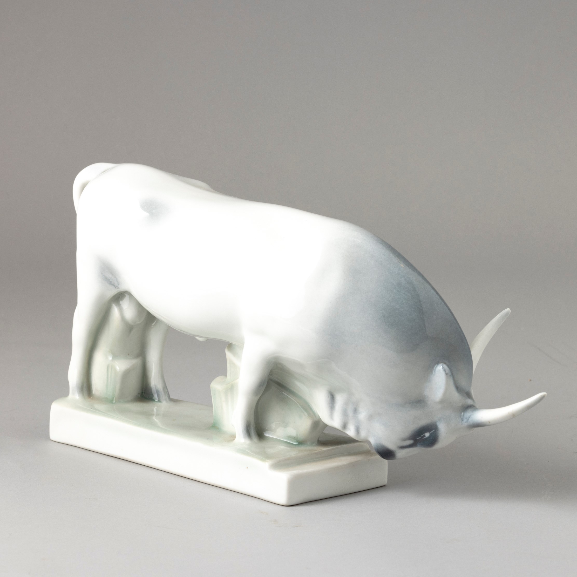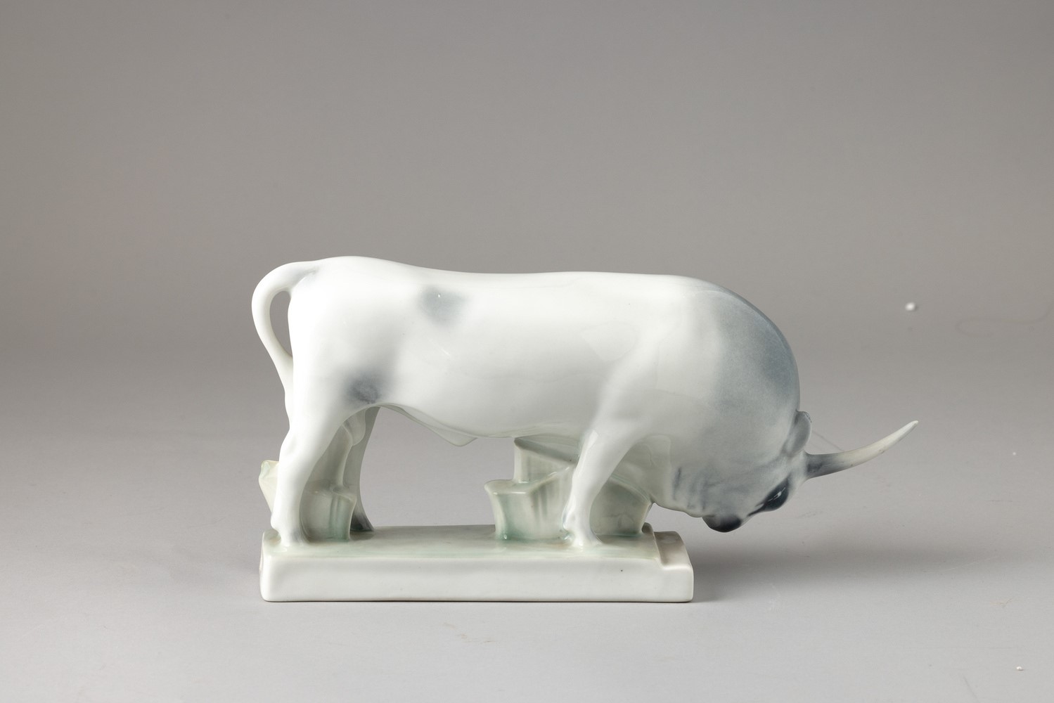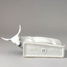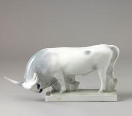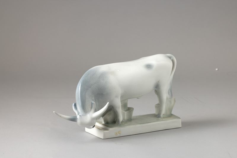 Rara figura di bisonte in porcellana decorata a smalti policromi.