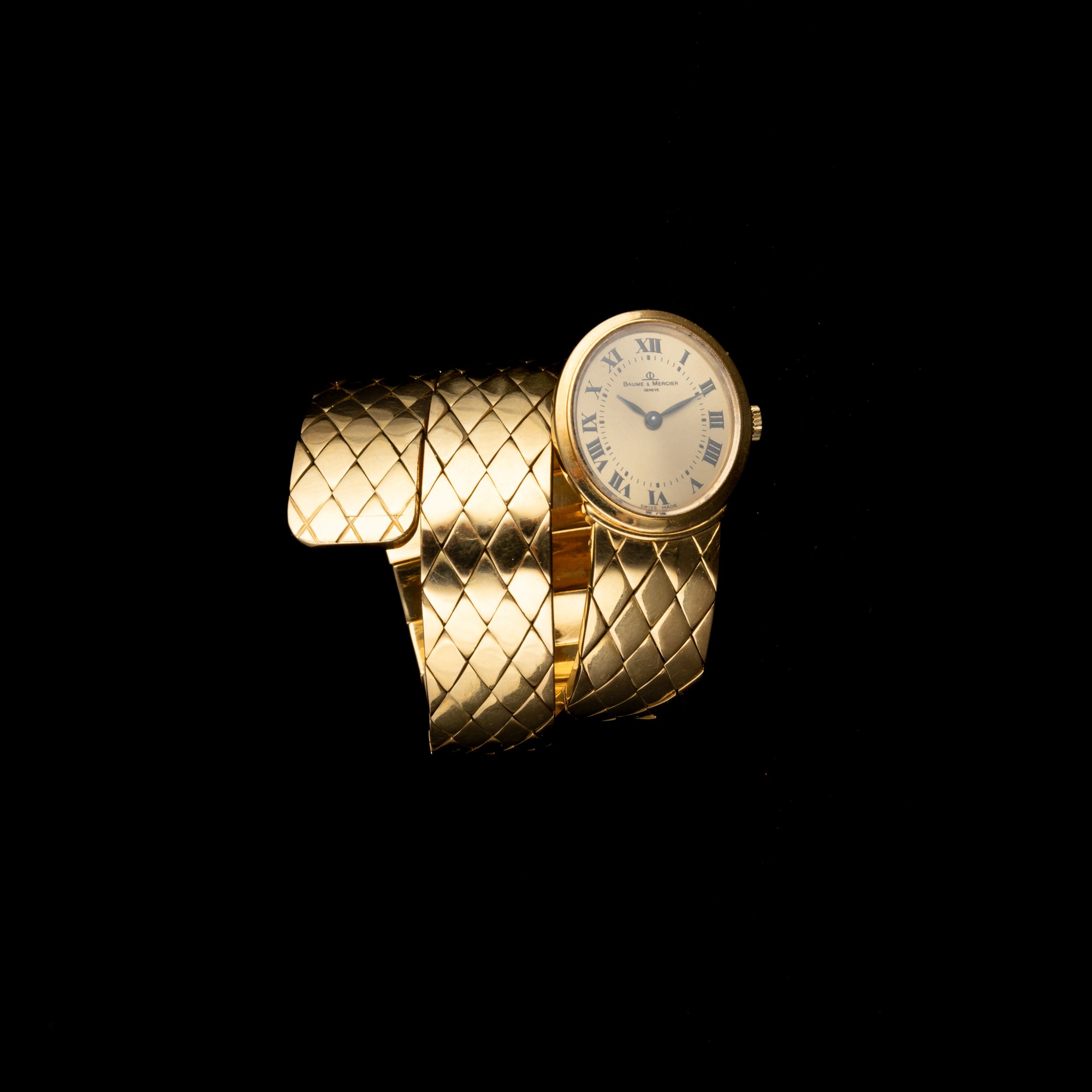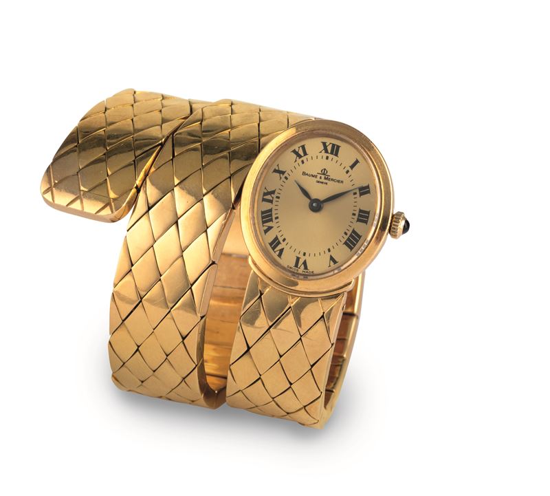 Serpenti in oro giallo 18k tre giri, quadrante Champagne numeri Romani, movimento a carica manuale