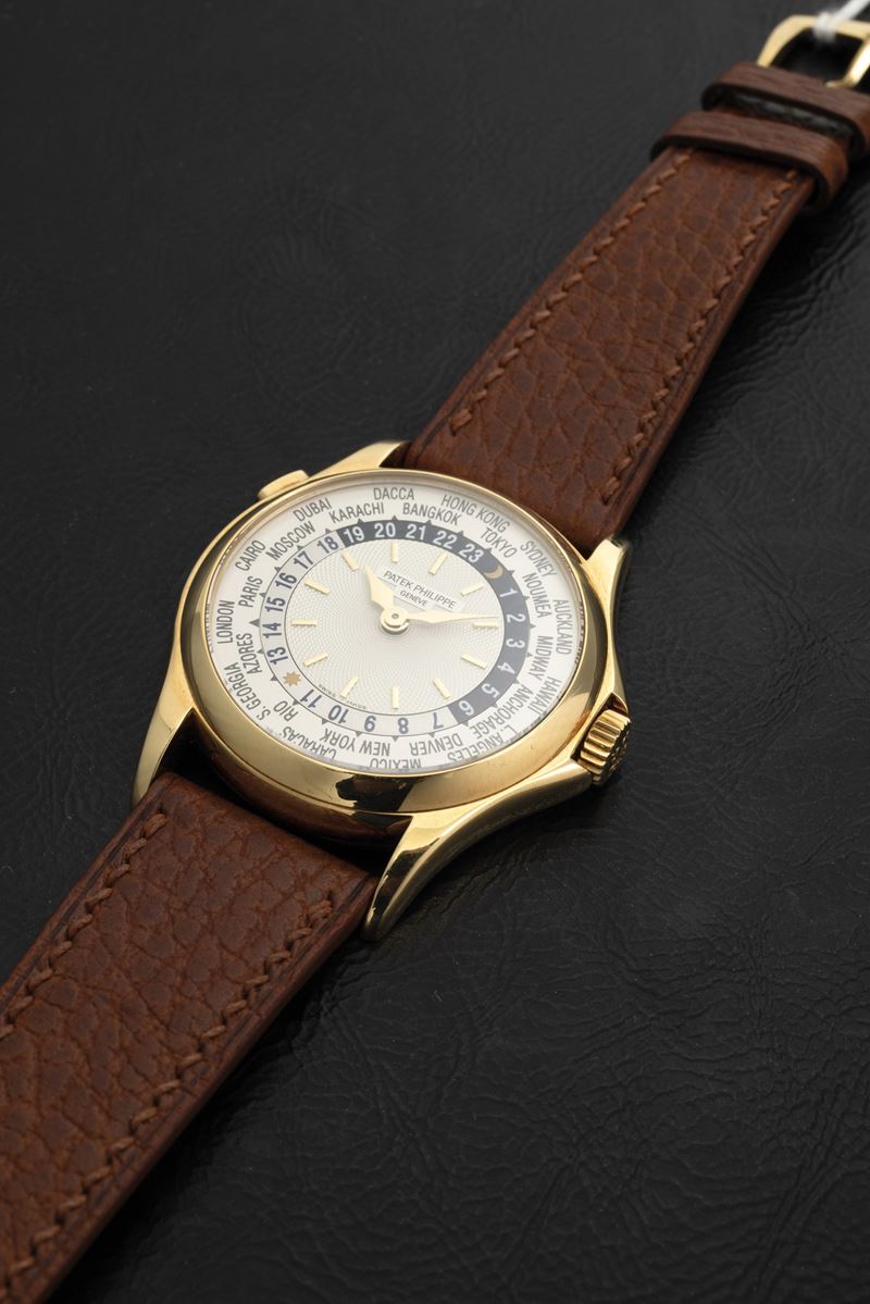 La referenza 5110 è stata introdotta nel 2000 ed è rimasta in produzione fino al 2006, lasciando posto alla successiva referenza 5130. Il presente orologio, realizzato in oro giallo ha una classica cassa Calatrava, il quadrante Argentè guillochè e un anello girevole con 24 nomi di città. Questo elegantissimo orologio, icona del marchio Patek, consente a chi lo indossa di tenere traccia sia dell’ora locale che di quella di casa con il semplice clic di un pulsante situato nella posizione ore 10.
