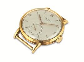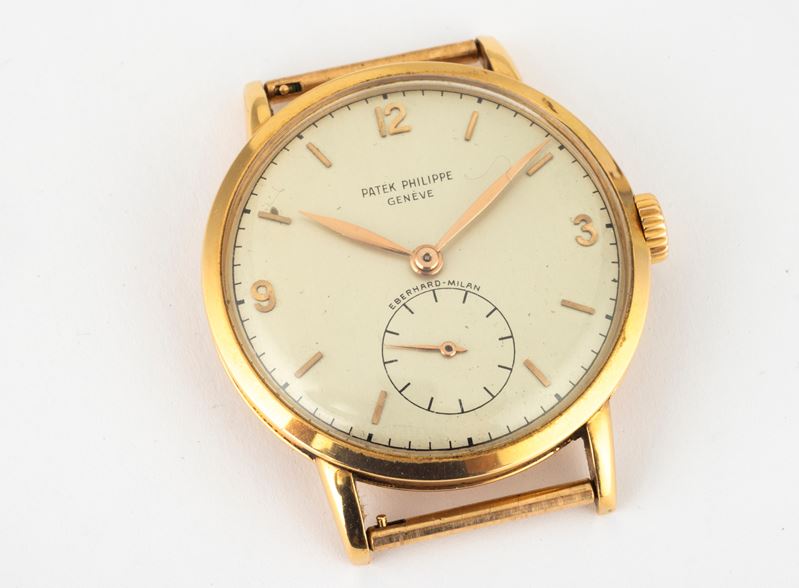 Raro ed elegante Calatrava ref 1513 in oro giallo 18k, quadrante retailer Eberhard Milano, numeri arabi applicati e piccoli [..]