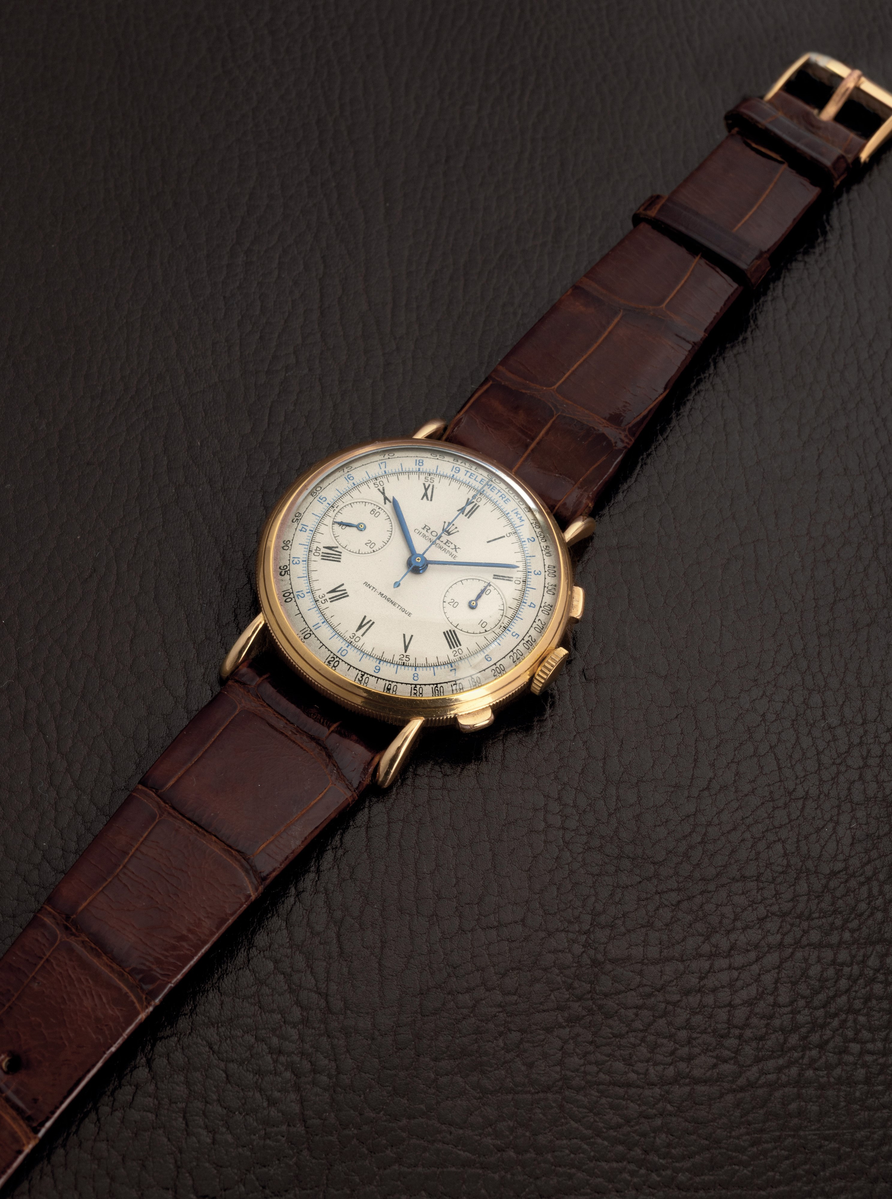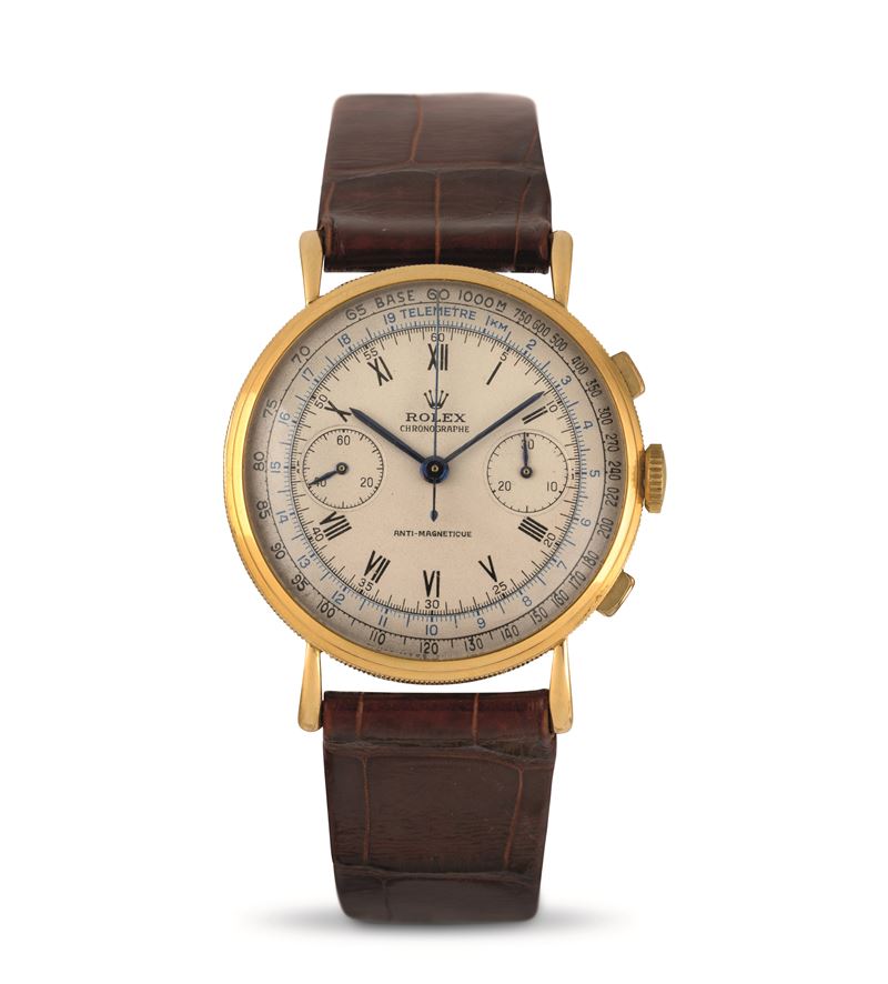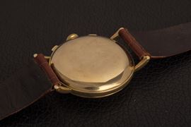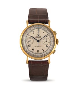 Cronografo Antimagnetico "cassa moneta" ref 4062 in oro giallo 18k due contatori quadrante argentè con scala tachimetrica [..]