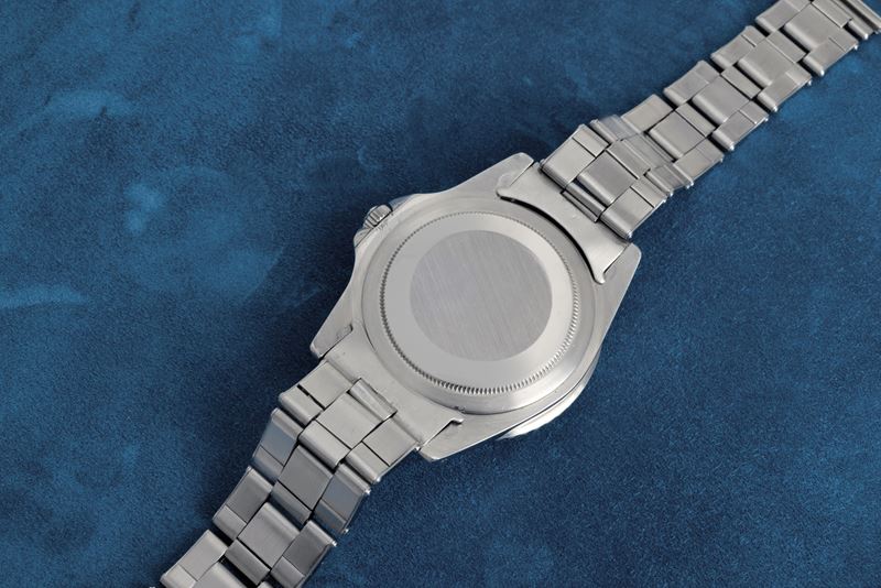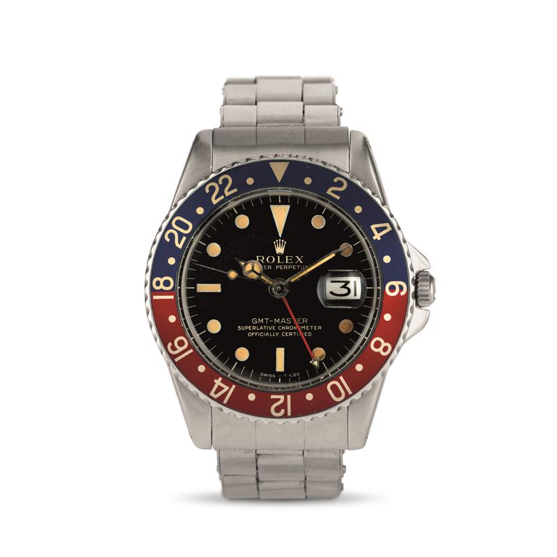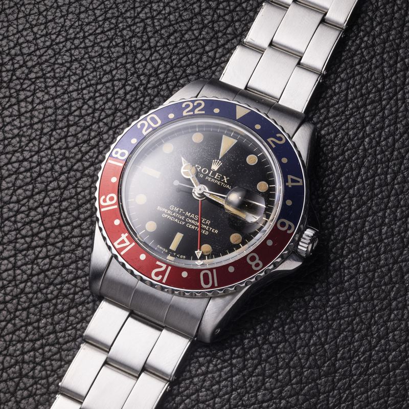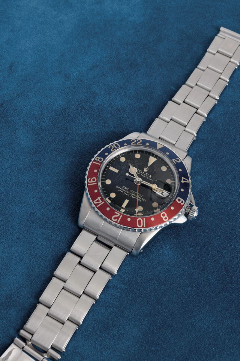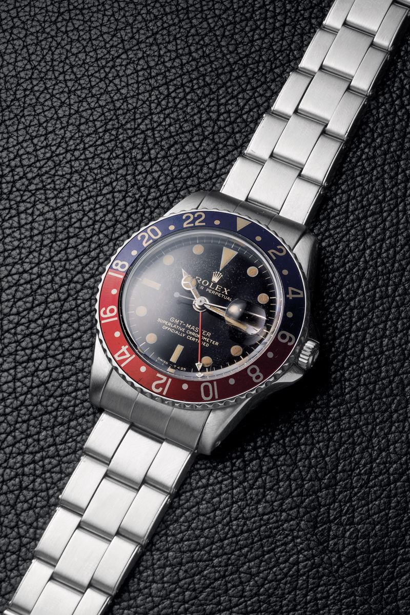 Il presente Rolex GMT-Master ref. 1675 del 1961 con la cassa in acciaio inossidabile è dotato di protezioni della corona a punta, note anche con il soprannome italiano di "Cornino".