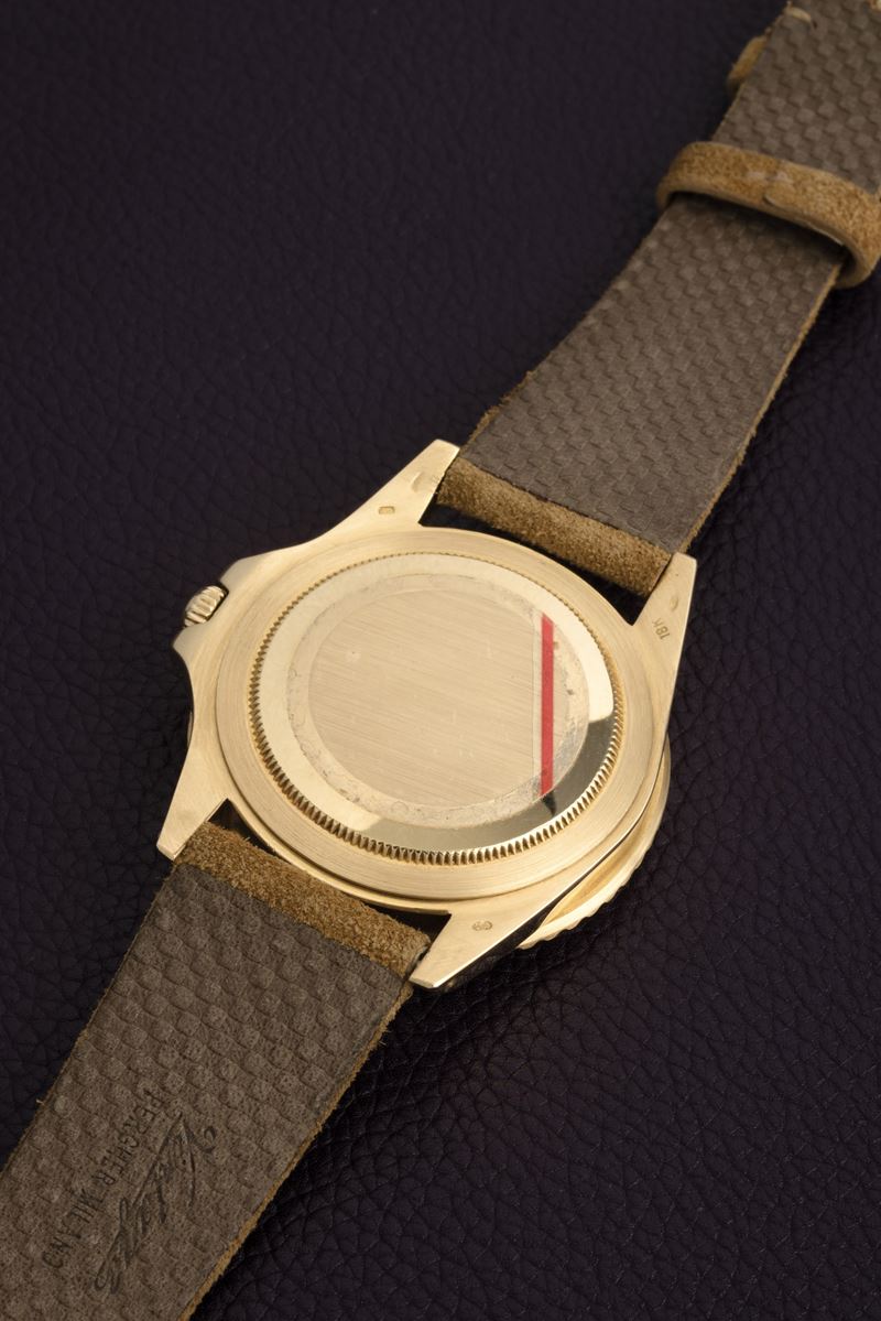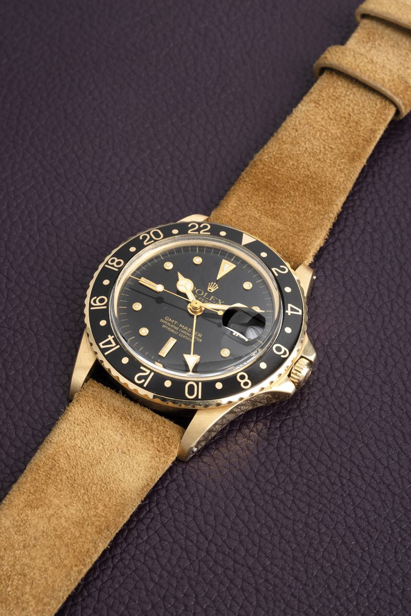 GMT Master ref 1675/8 in oro giallo 18k, quadrante nero Nipple e cinturino in pelle