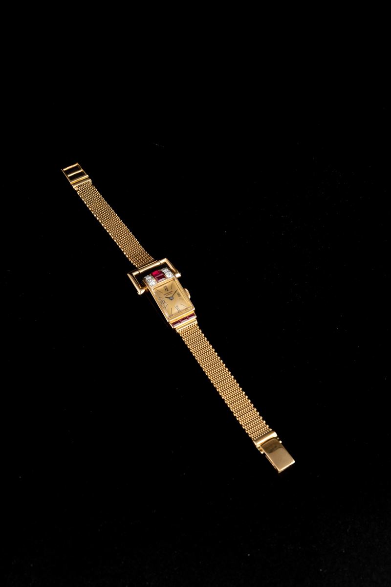 Orologio da Cocktail in oro giallo con diamanti e rubini incastonati, ansa superiore snodata, carica manuale
