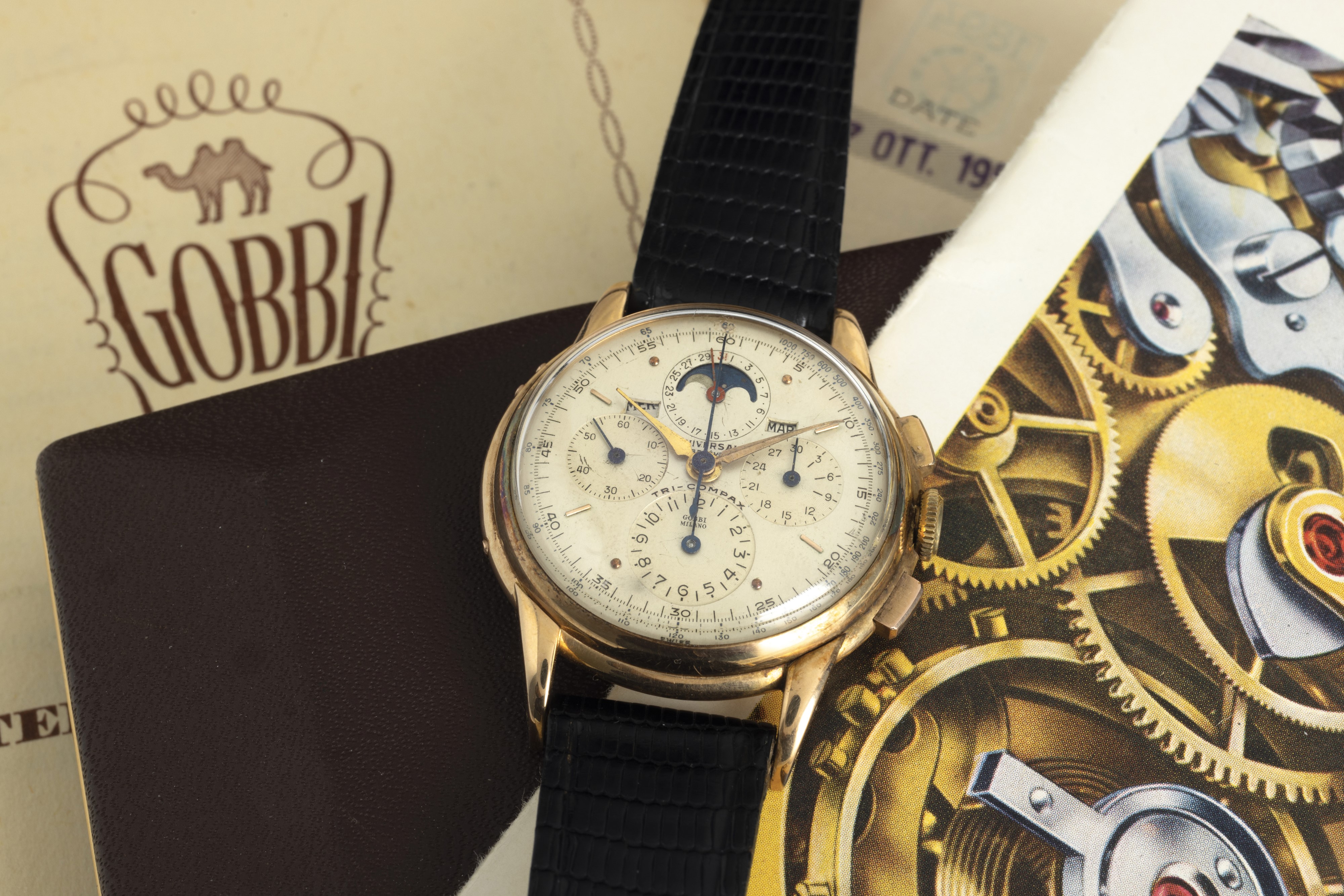 Tricompax ref 12268 in oro giallo 18k retailer "Gobbi Milano" cronografo e calendario con fasi lunari accompagnato da garanzia originale e del rivenditore