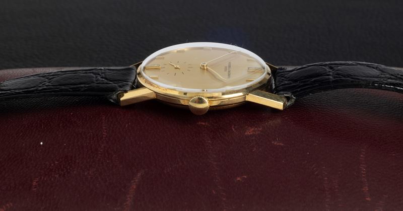 Elegante Patrimony ref 6413 in oro giallo 18k, quadrante dorato con satinatura verticale e anse svasate