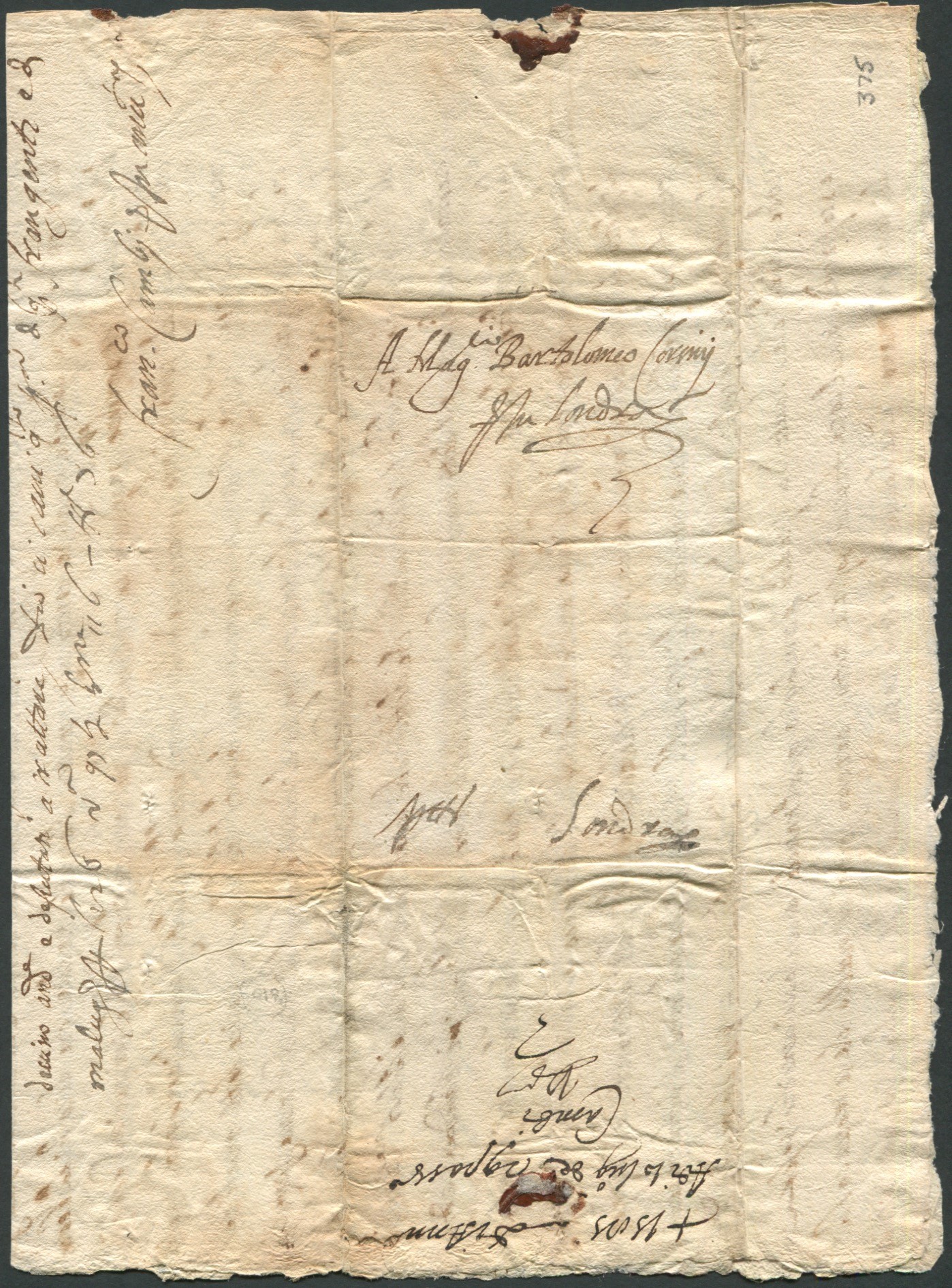 Lettera del 29 giugno 1585 manoscritta da Franco Cambi durante l’assedio di Anversa, da parte spagnola, ed inviata a Bartolomeo Corsini, caro amico, a Londra presso Gracechurch Street ove il Corsini e la moglie amavano soggiornare durante i loro periodi londinesi. Straordinario documento storico-postale. Ex collezione Robson Lowe. Grande rarità.