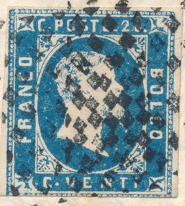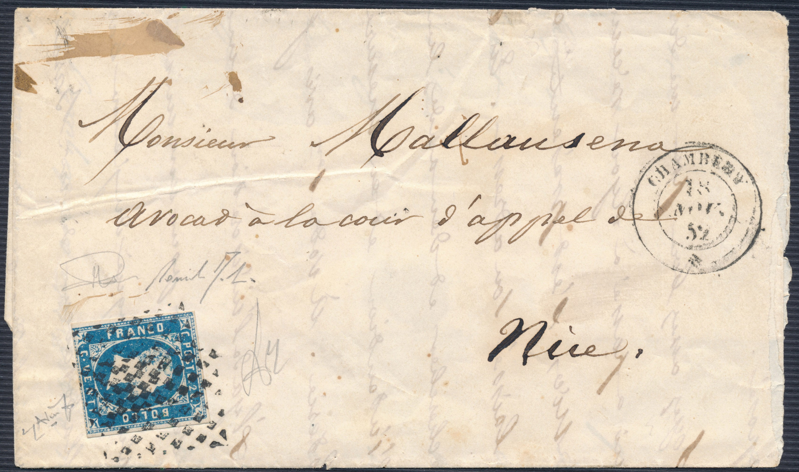 Lettera da Chambery (Savoia) a Nizza del 18 novembre 1852 affrancata, in tariffa primo porto delle lettere per l’interno, con francobollo di Sardegna, 1851, 20 cent. azzurro chiaro, I tiratura (Sass. n. 2g) annullato con: