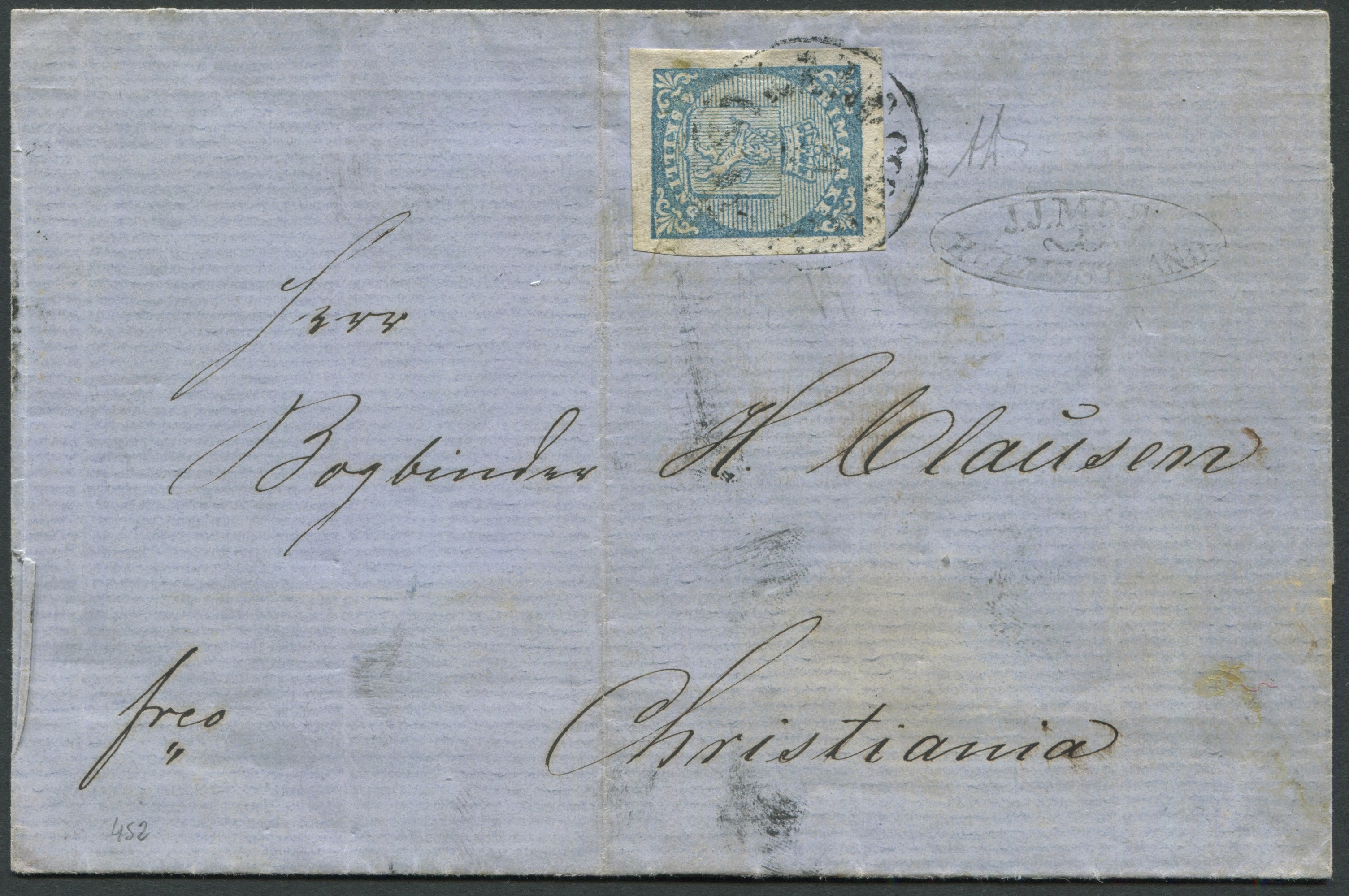 1855, Norvegia, Lettera per Christiania (Oslo), affrancata con 4 sk. azzurro (YV.1)