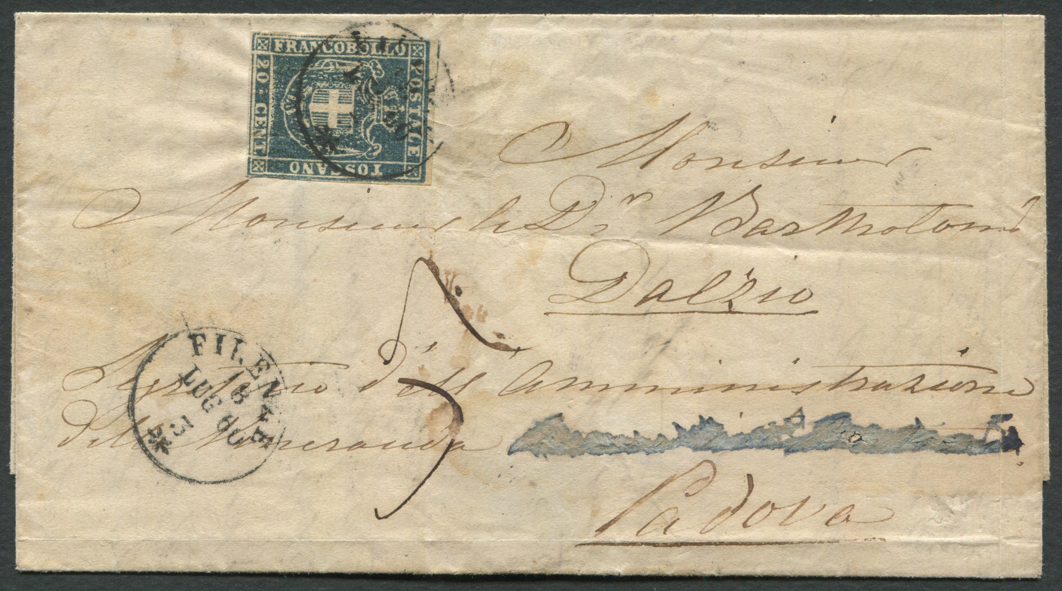18 luglio 1860, lettera da Firenze a Padova. Segno di tassa di 5 soldi. Interessante