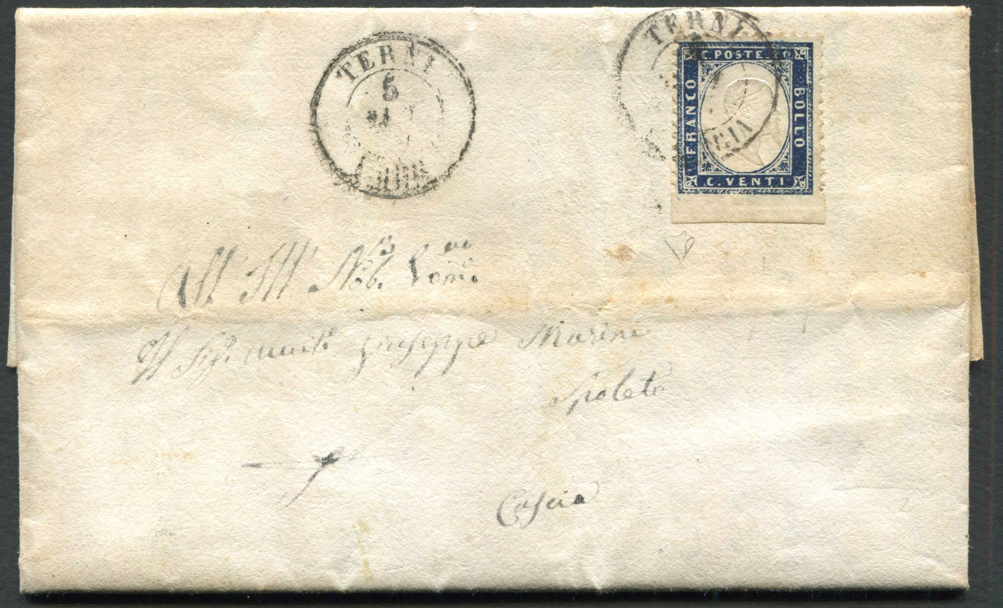 1862, Regno d’Italia, Lettera da Terni per Cascia, del 5 settembre 1862, affrancata con 20 cent. indaco, bordo di foglio [..]