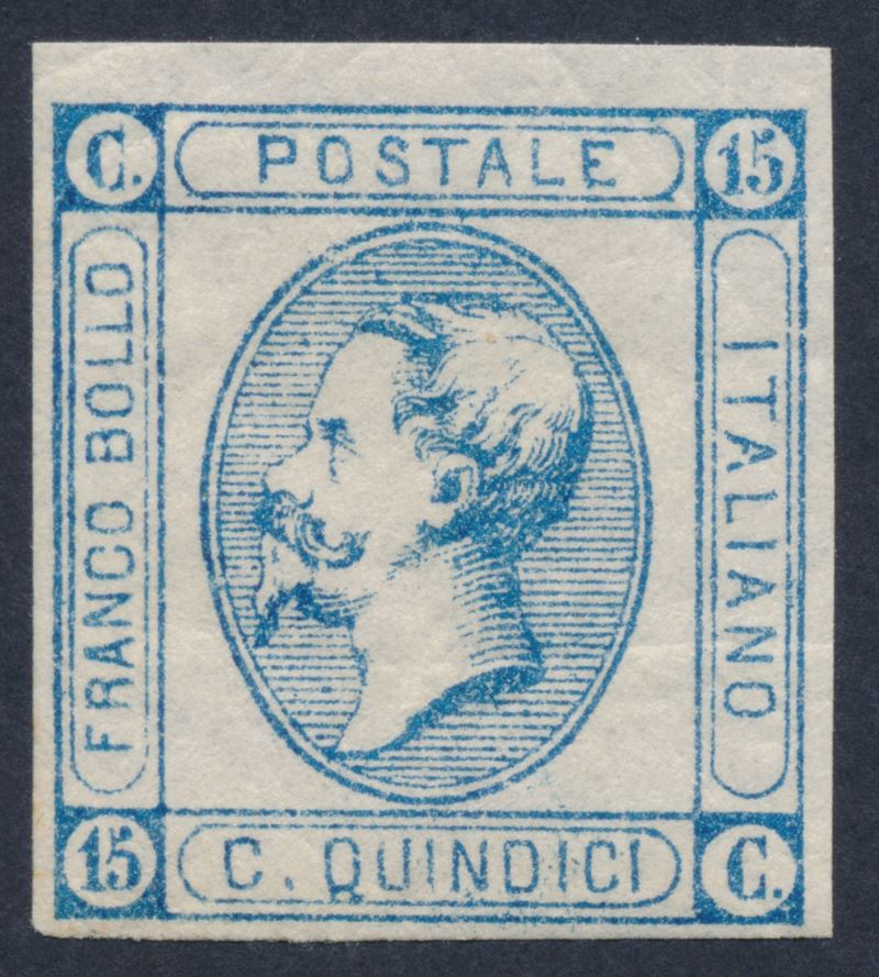 1863, Regno d’Italia, 15c. azzurro, I tipo, (12) con gomma integra screpolata