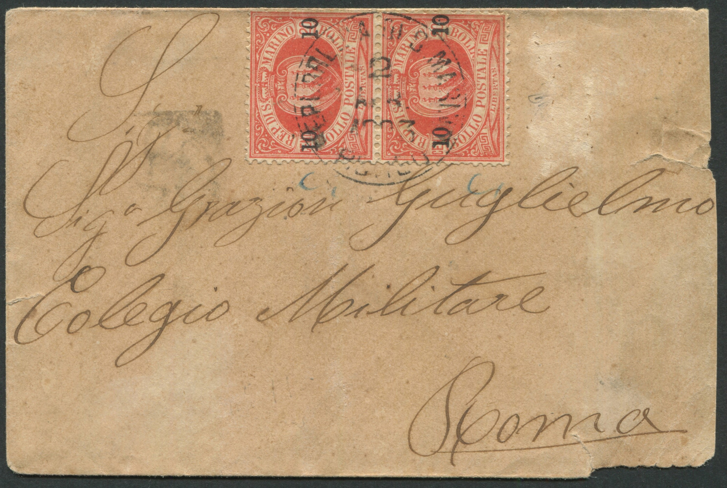 1893, S. Marino, piccola busta per Roma del 2 aprile 1893, affrancata con coppia del 20 cent. rossi soprastampati “10-10” [..]