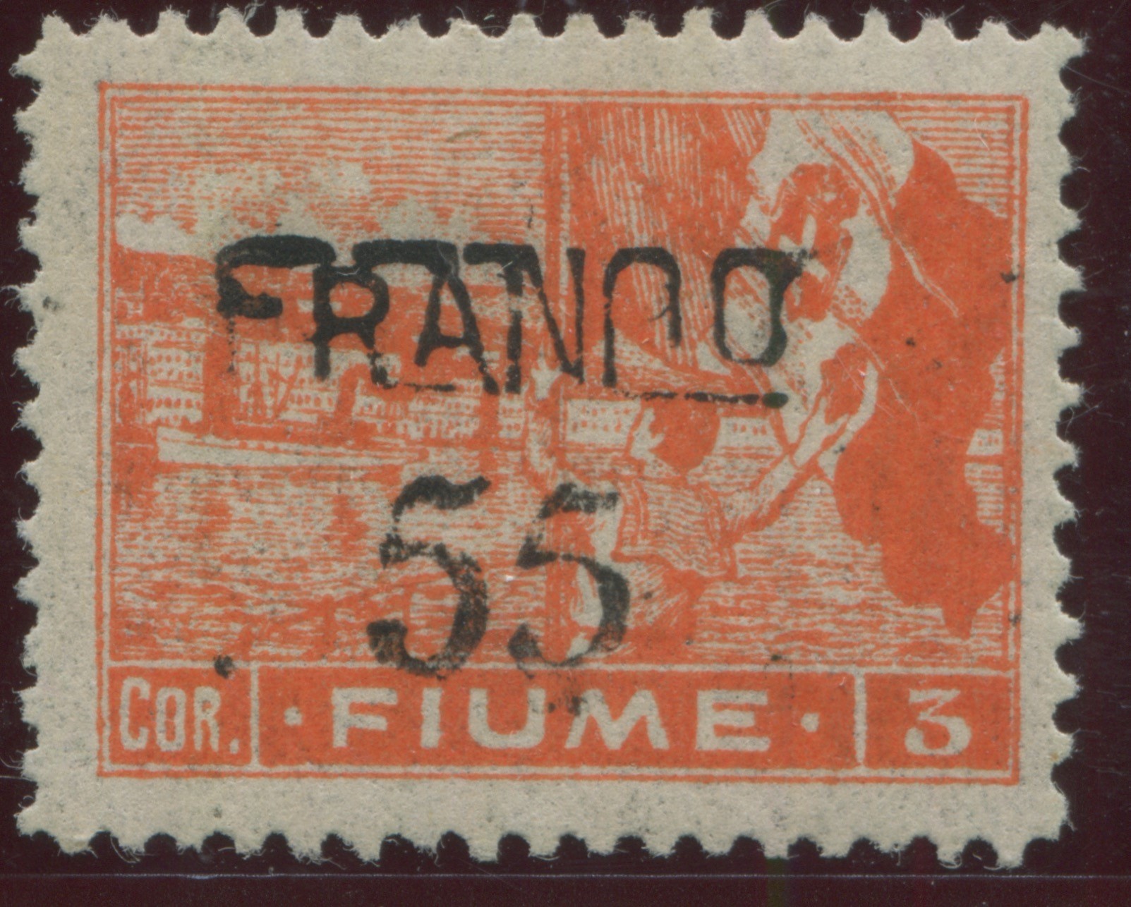 1919, Occupazioni 1 Guerra Mondiale, Terre Redente, Fiume, serie “Allegorie”, 55 su 3c. vermiglio arancio, carta B sottile e semi trasparente (B85), gomma originale. Firma: Oliva. Raro