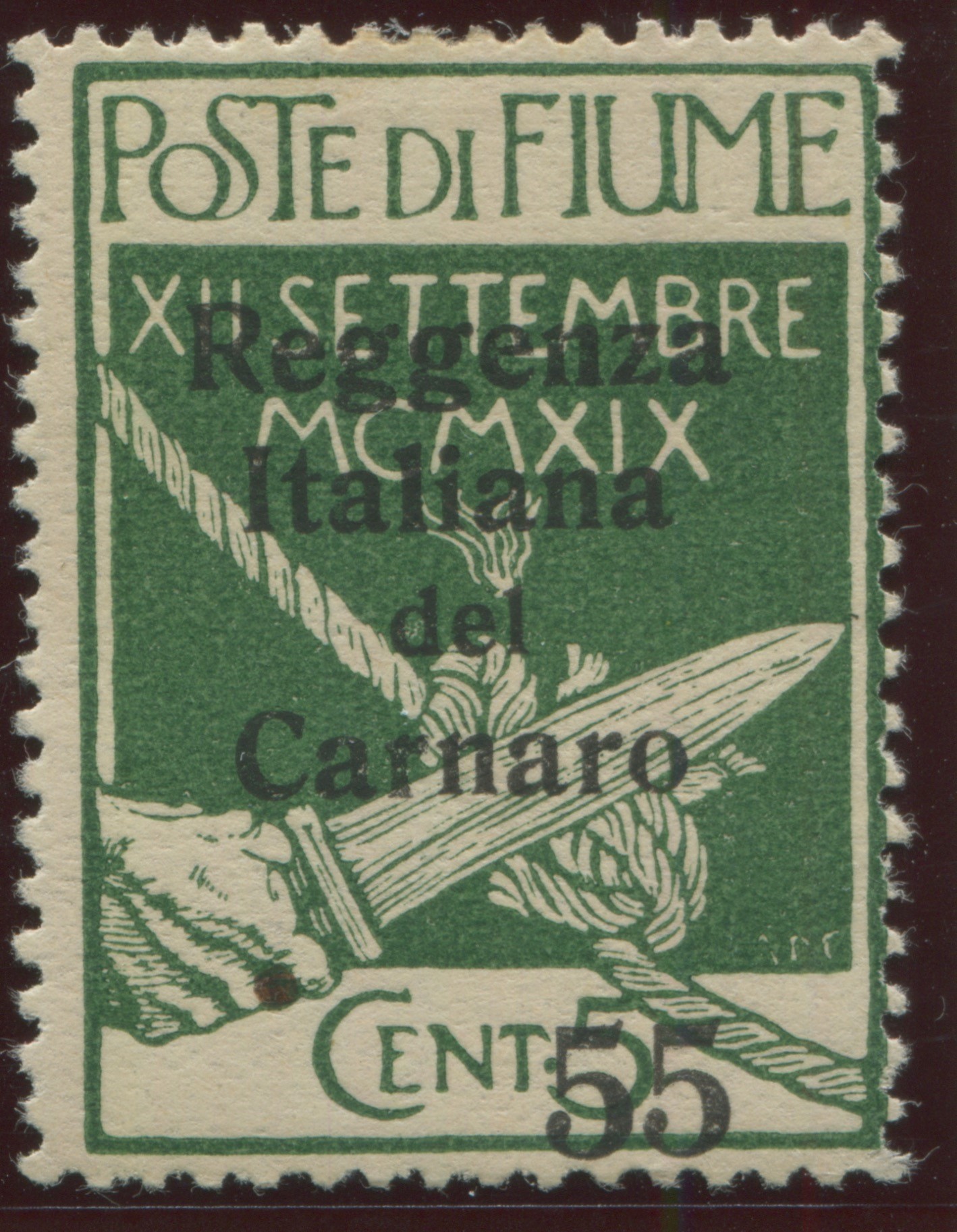 1920, Fiume, Francobollo “Ingresso dei Legionari a Fiume” soprastampato “Reggenza Italiana del Carnaro”, 55 su 5c. verde, [..]