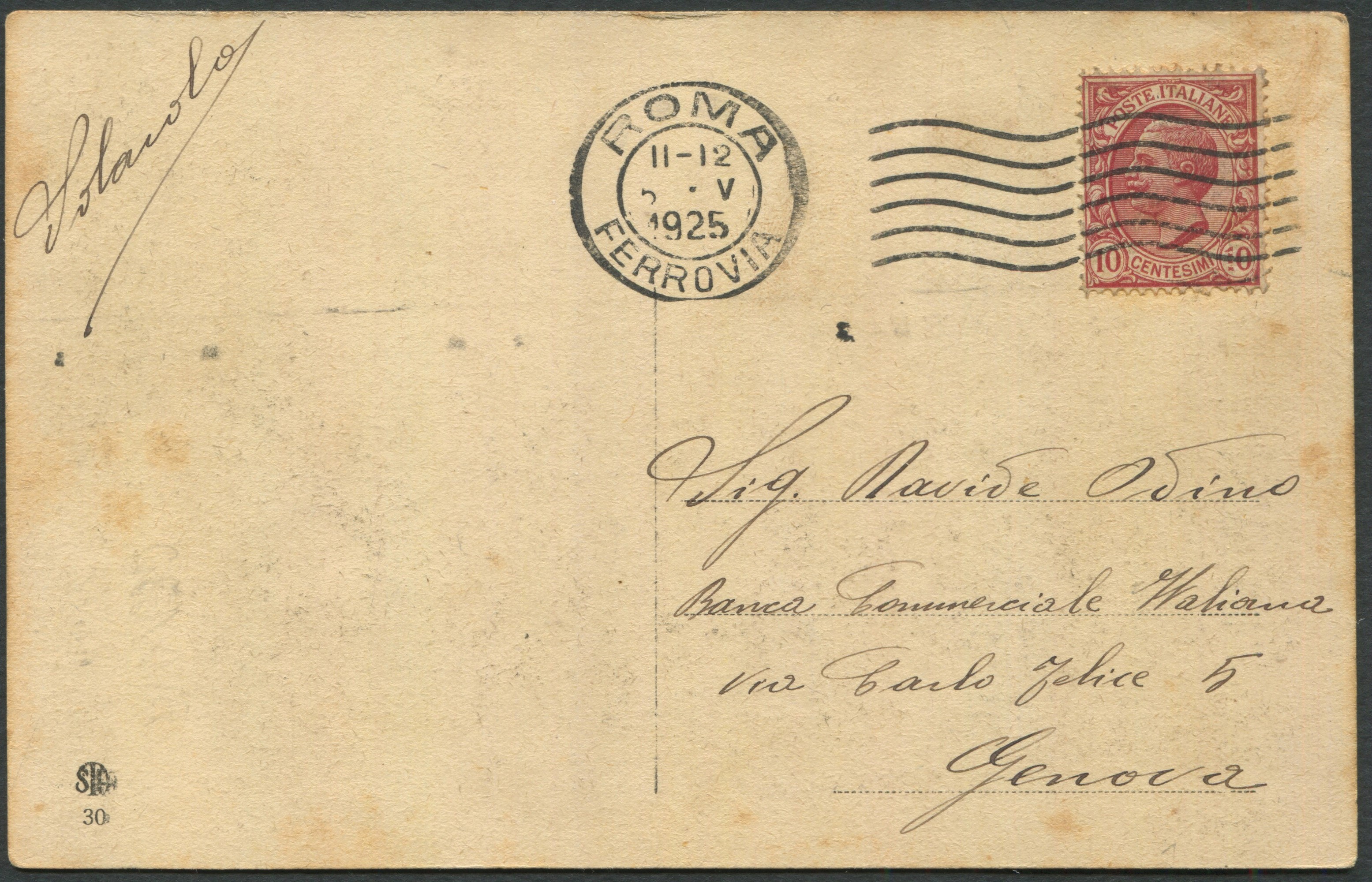 1925, Regno d’Italia, Cartolina da Roma per Genova affrancata con 10 c. rosa carminio con varietà “cifra 1 del 10 di destra [..]