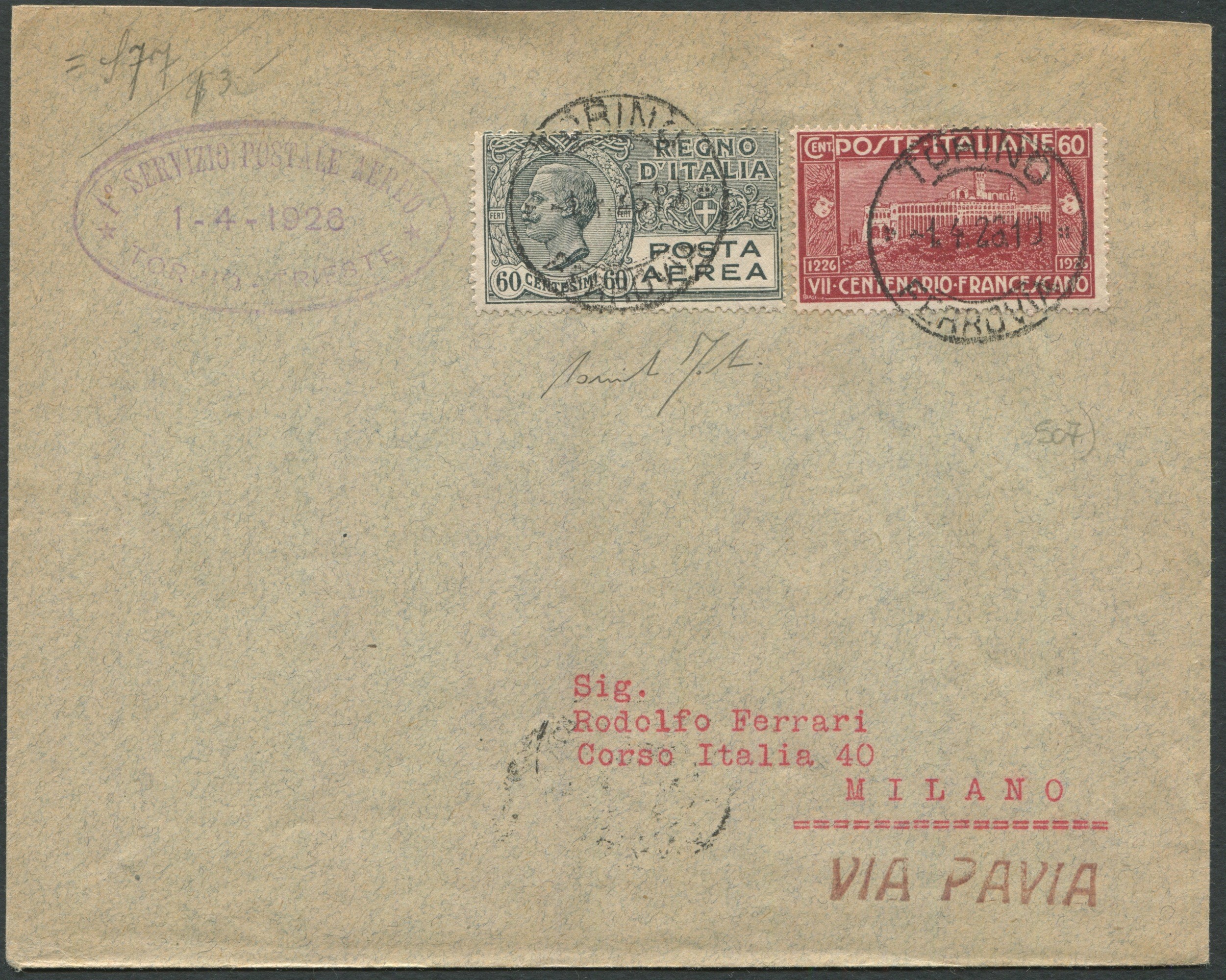 Linea Torino-Pavia-Venezia-Trieste, 1° aprile 1926, Primo volo Torino-Pavia. Aerogramma da Torino a Milano via Pavia, Dispaccio composto da 115 aerogrammi, la corrispondenza per Milano, senza ricevere anullo di transito,fu fatta proseguire da Pavia con mezzi ordinari ed annullata all’arrivo ci Annullo Circolare a doppio cerchio meccanico. Fabris