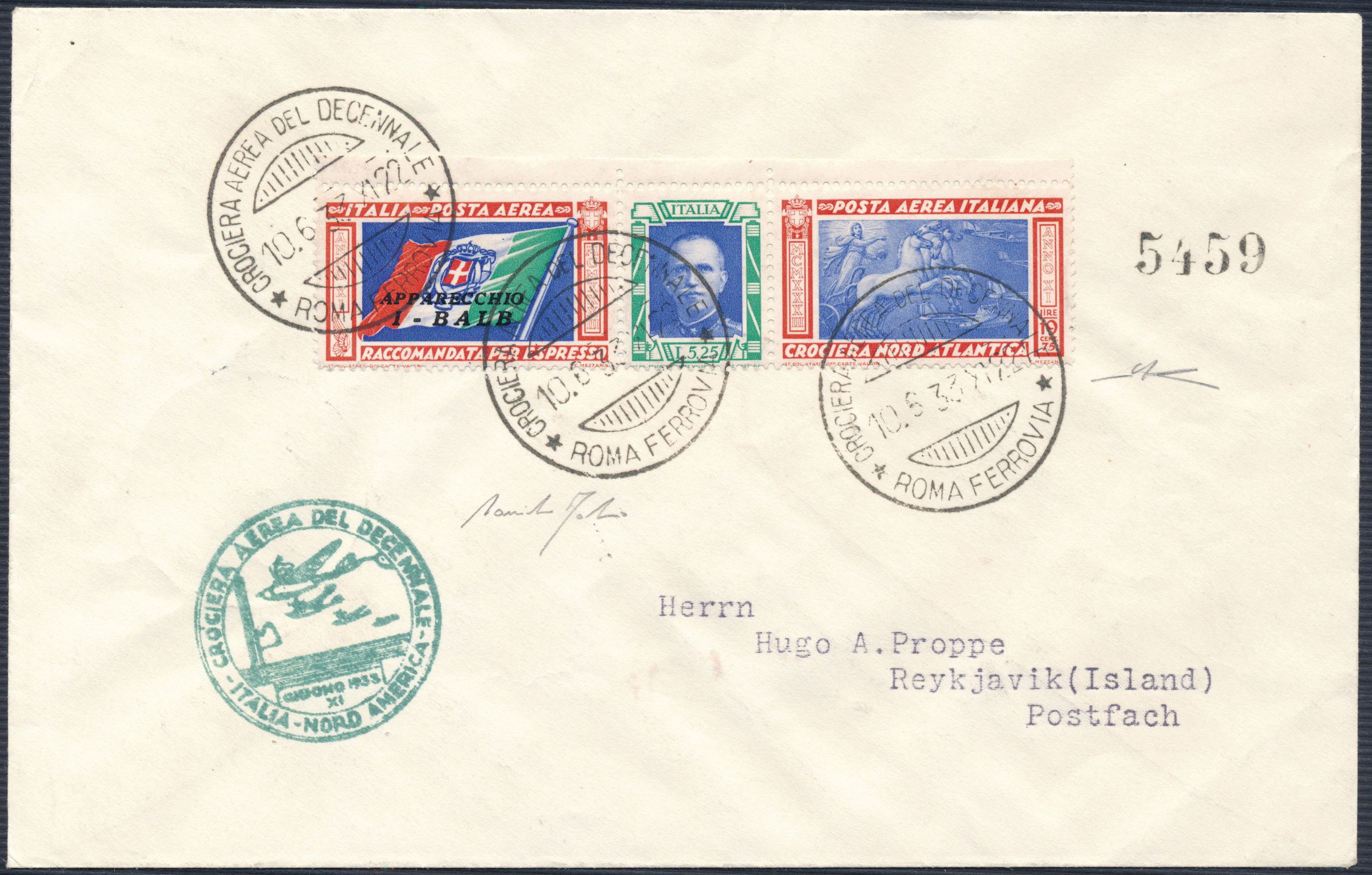 Regno D’Italia. Crociera Aerea del Decennale. Aerogramma da Roma a Reykjavik del 10 giugno 1933 affrancato con francobollo trittico di posta aerea, appositamente emesso, soprastampato I-BALB 525+1975 lire policromo (51A). Al recto Annullo Speciale Circolare, quale annullatore, e Timbro Speciale, in verde. Al verso Annullo di arrivo a destino. Eccellente qualità. Cert. Fabris e Manzoni