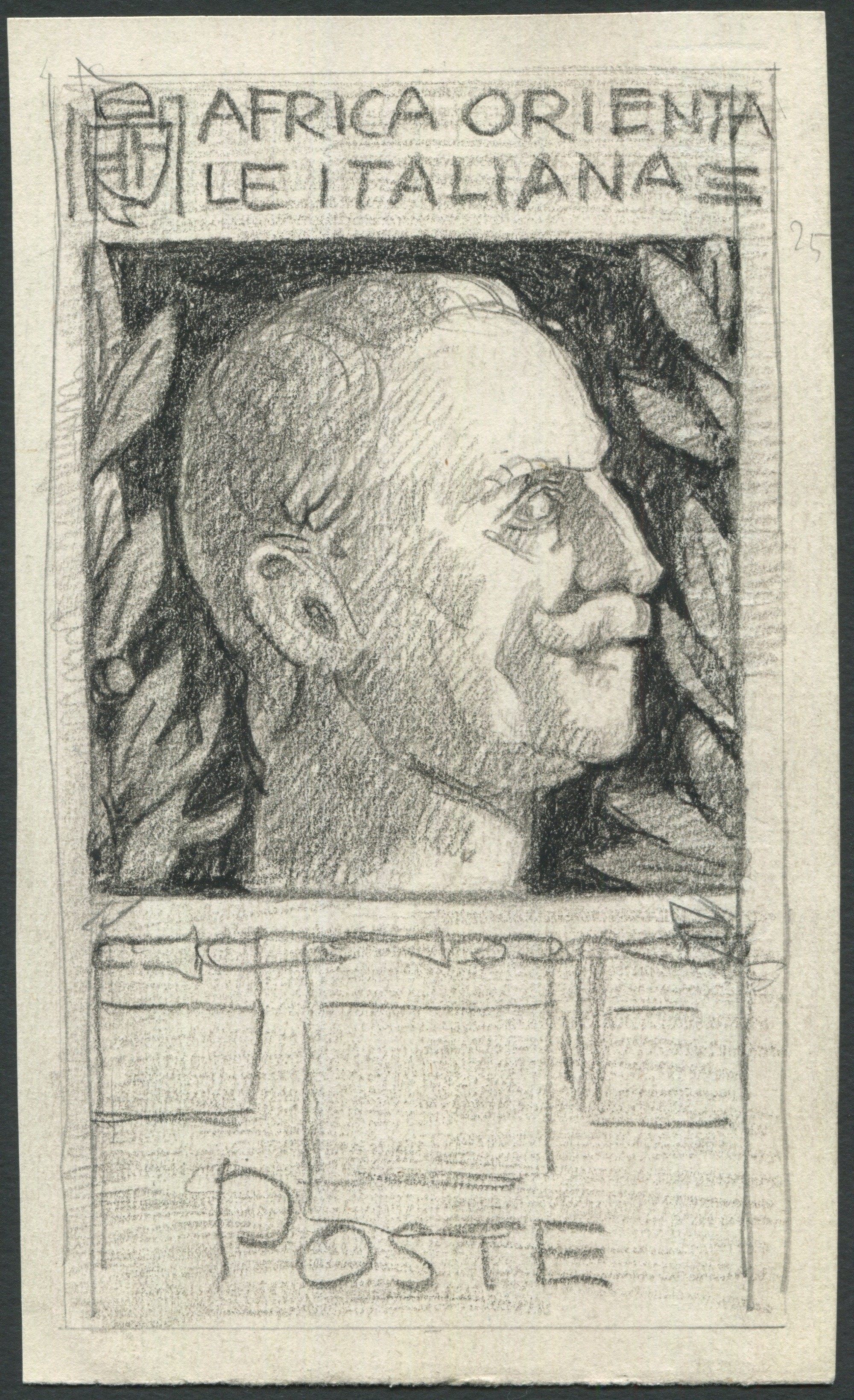 1938, Africa Orientale Italiana, Bozzetto a matita su cartoncino avorio (sp. 0,2 mm.) di dimensione 9,5 x 16 cm. per francobollo adottato. Firma: Fabris