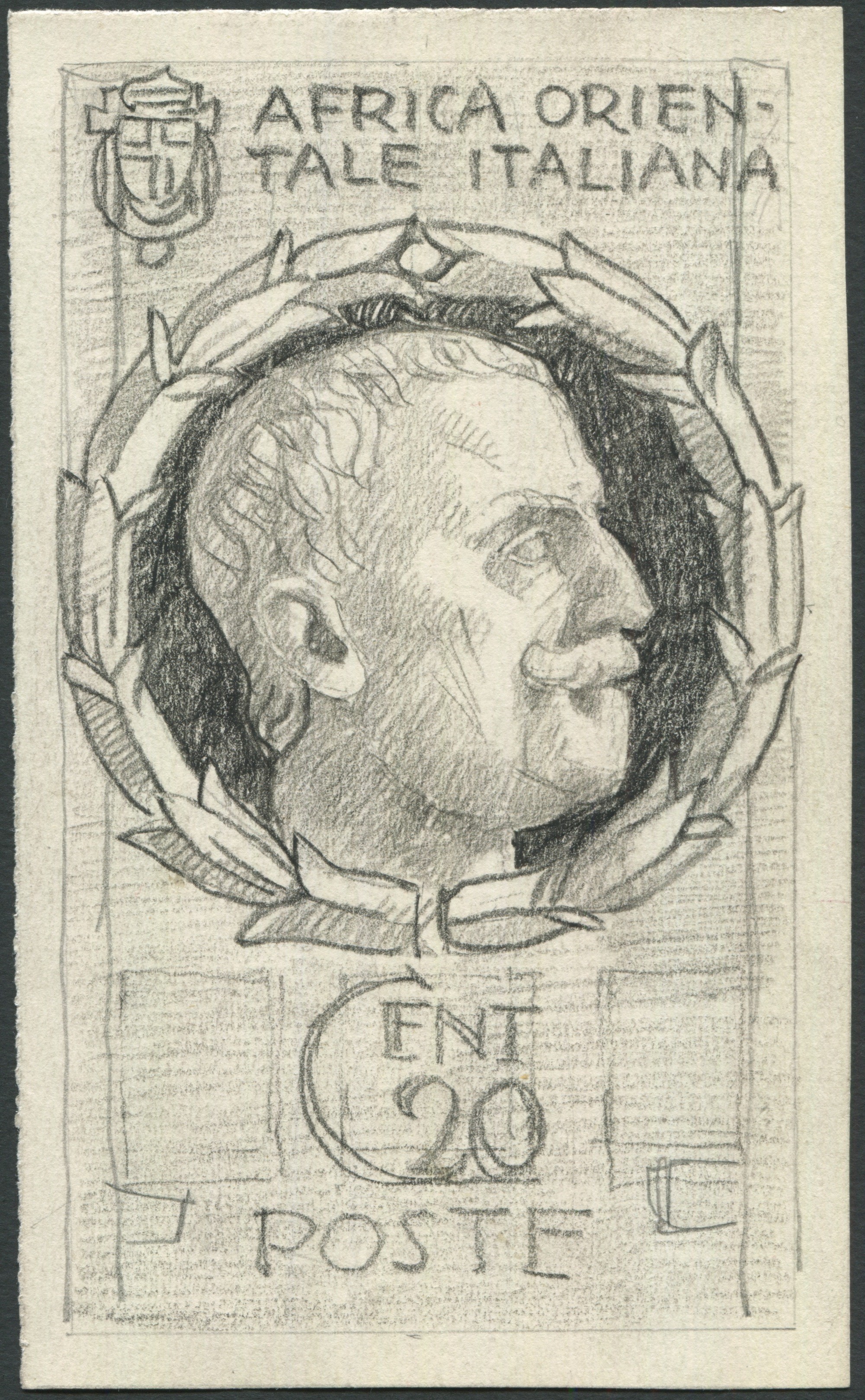 1938, Africa Orientale Italiana, Bozzetto a matita su cartoncino avorio (sp. 0,2 mm.) di dimensione 9,5 x 16 cm. per francobollo non adottato. Firma: Fabris
