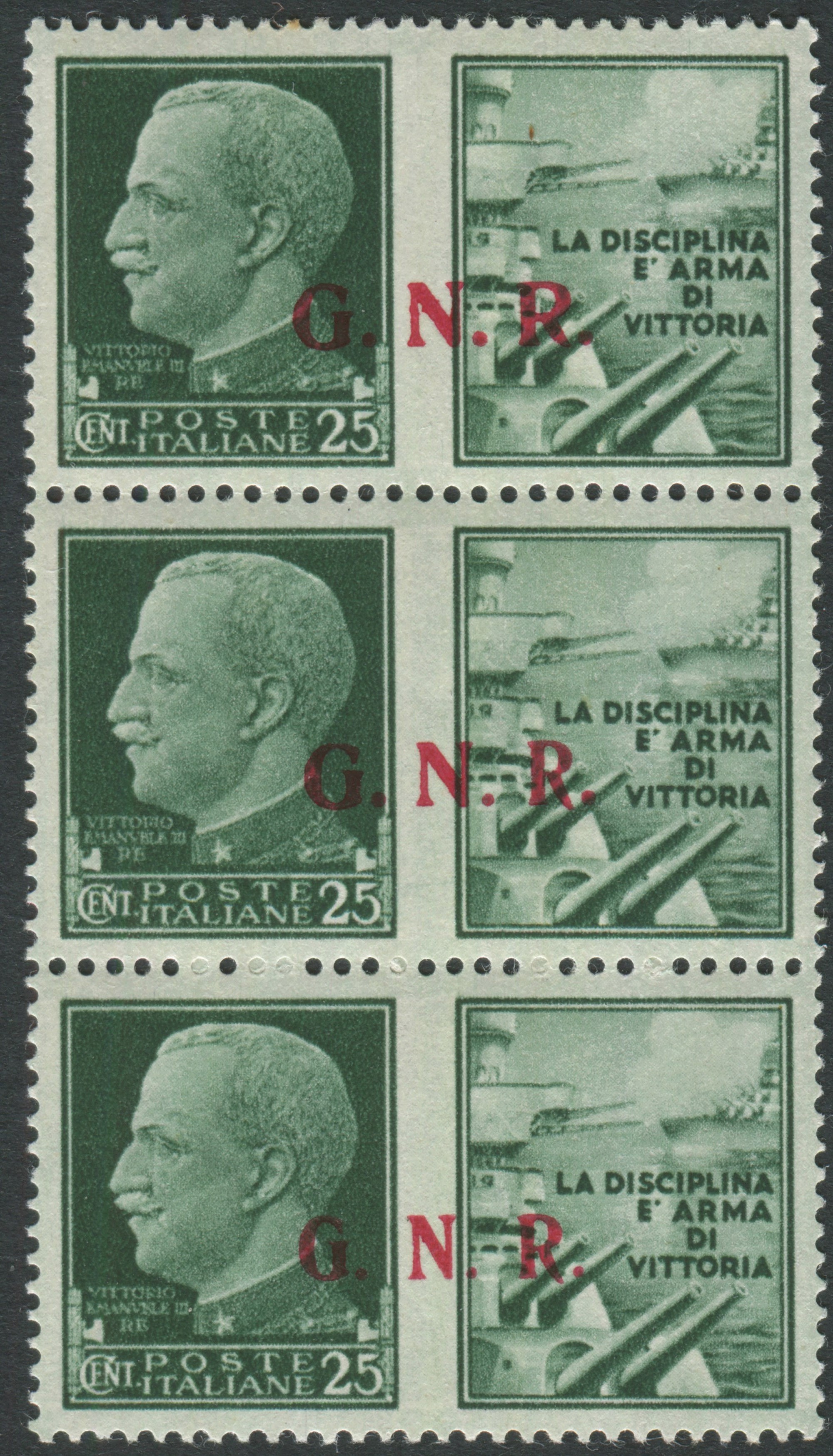 1944, Repubblica Sociale Italiana, Propaganda di Guerra, Trittico del 25 cent. verde con varietà (13/I, 13/Ia e 13/II). Posizioni 20, 25 e 30. Interessante varietà, non comune. Raybaudi