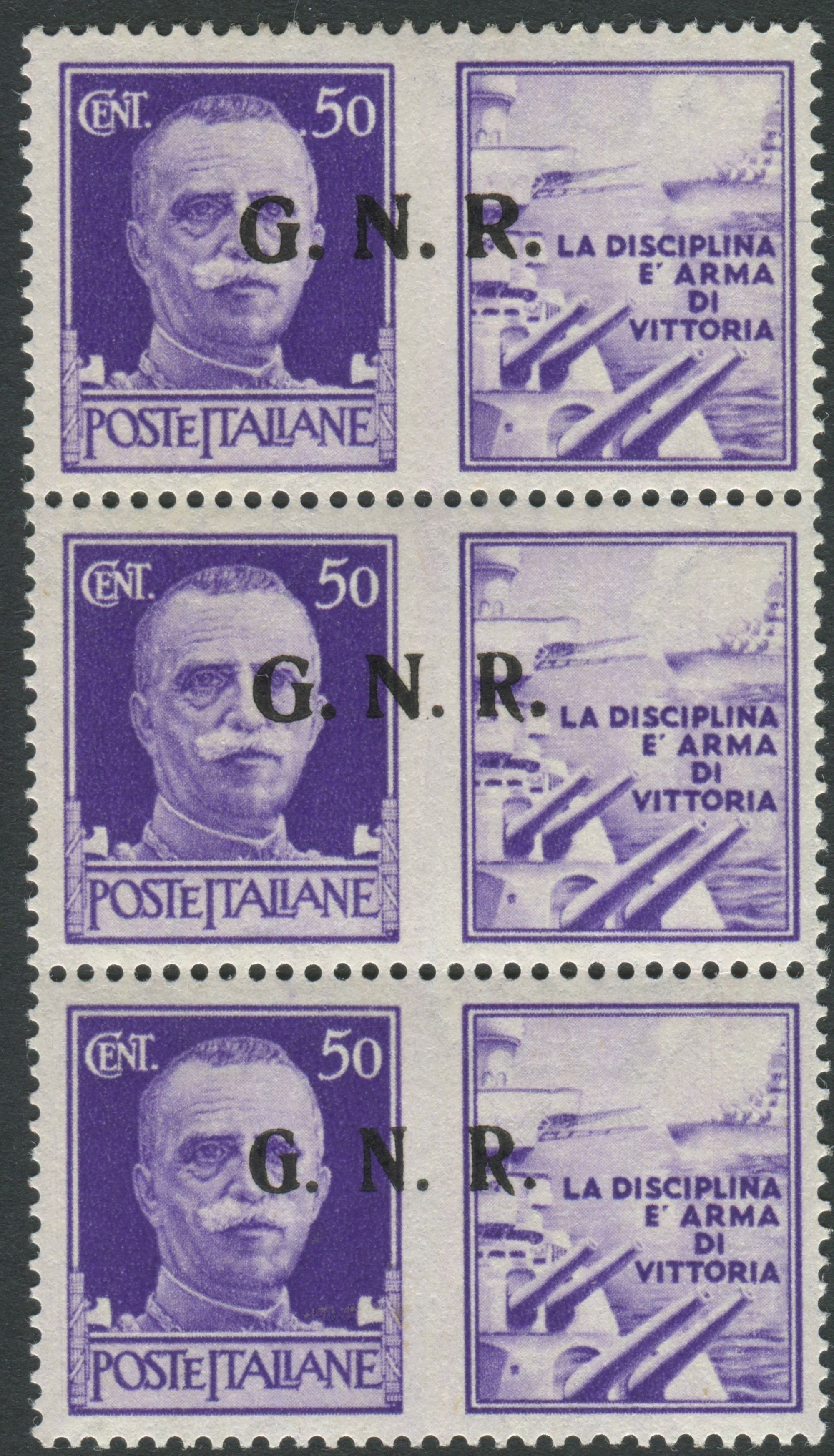 1944, Repubblica Sociale Italiana. Propaganda di guerra, Trittico verticale del 50 cent. tipo II con soprastampa di Brescia del II e III tipo (21/I, 21/Ia e 21/II) Posizioni 20, 25 e 30. Non comune, molto bello. Raybaudi