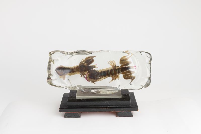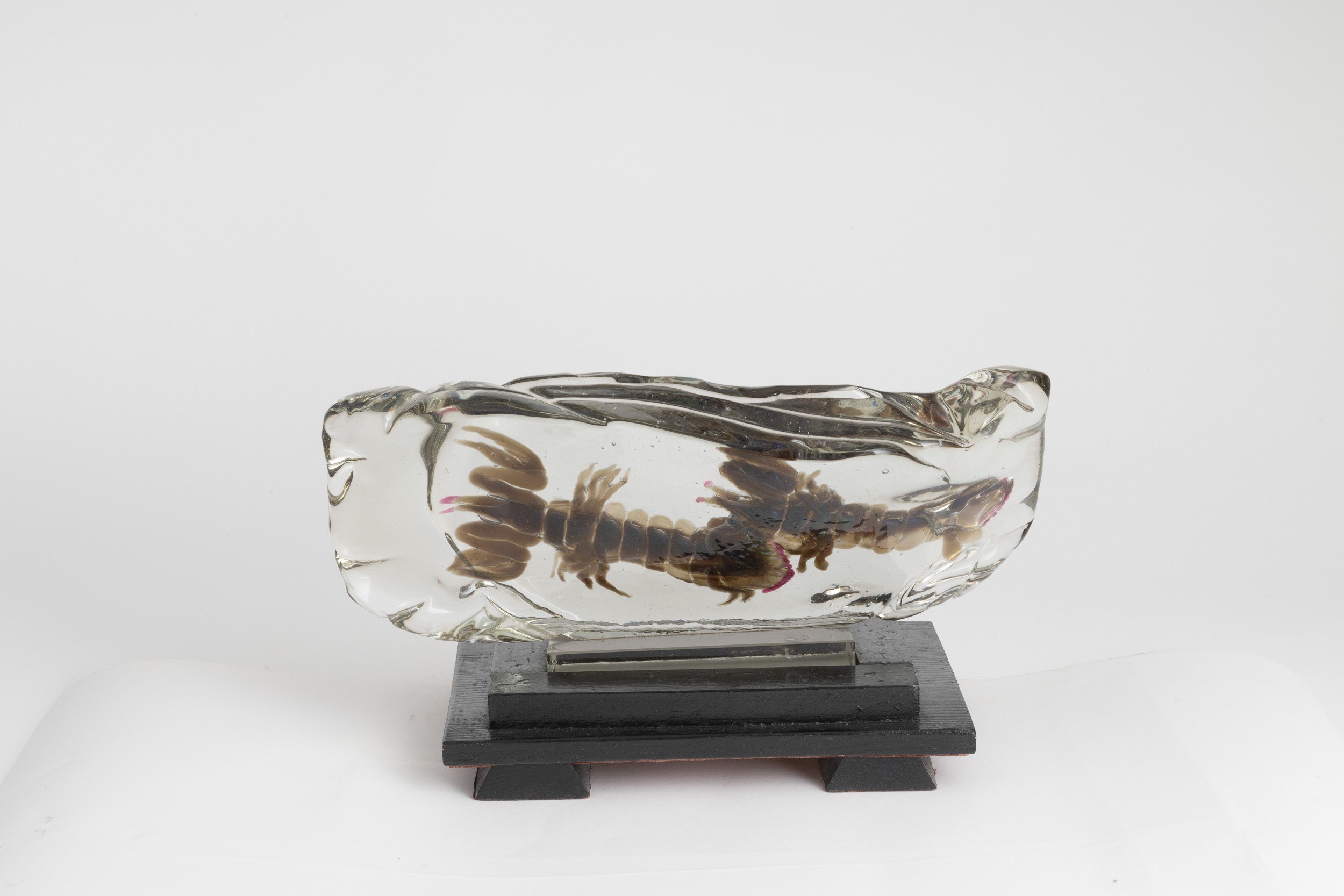 Placca in vetro lavorato a caldo con canocchie sommerse. Basamento in legno.