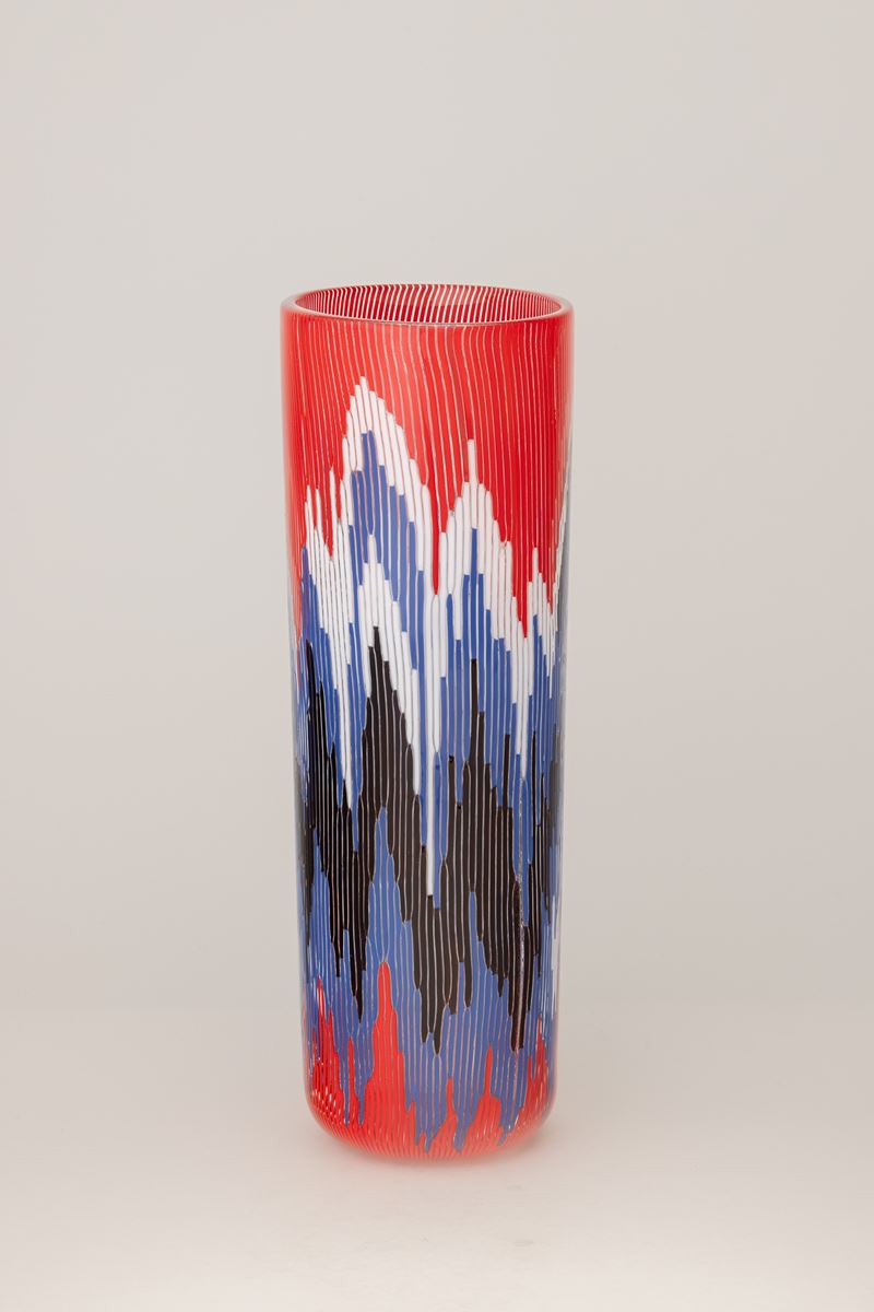 Vaso serie Fiamme di forma troncoconica a sezione ovale con decoro di canne policrome.