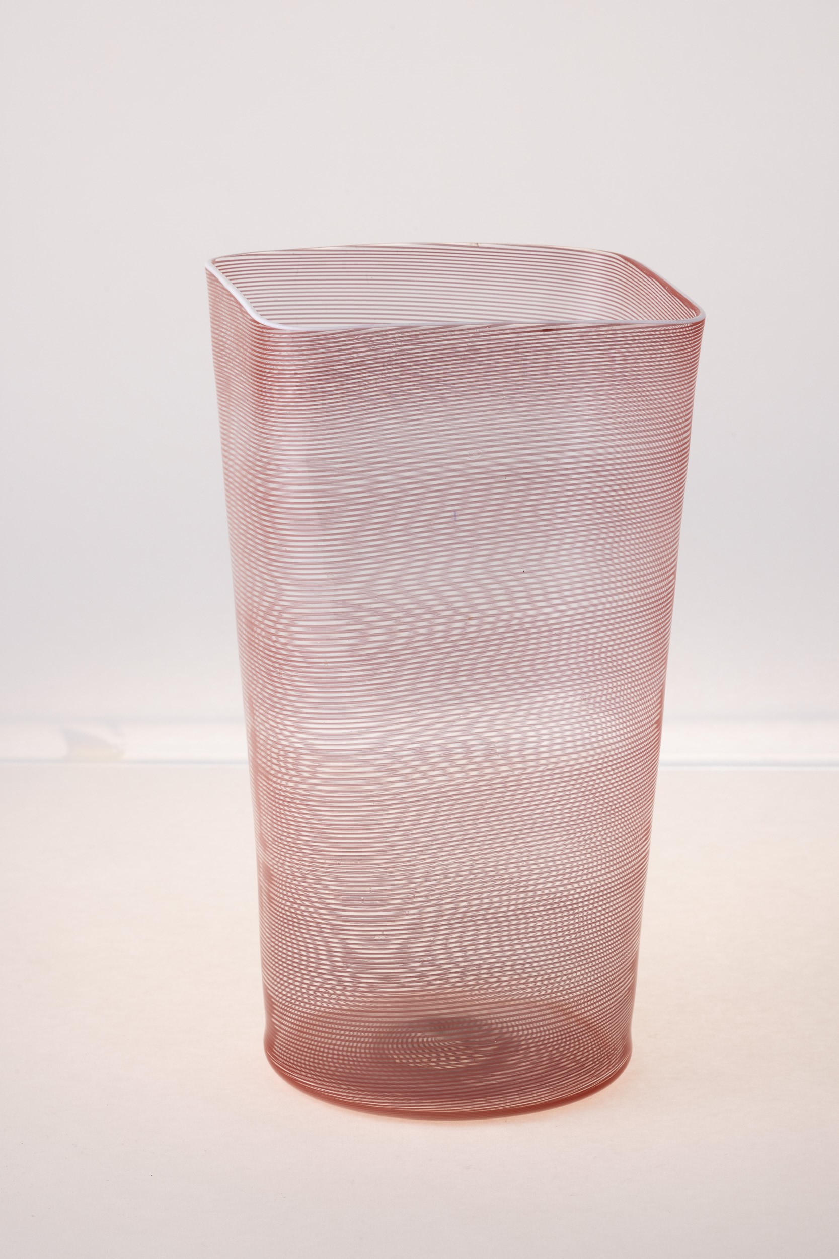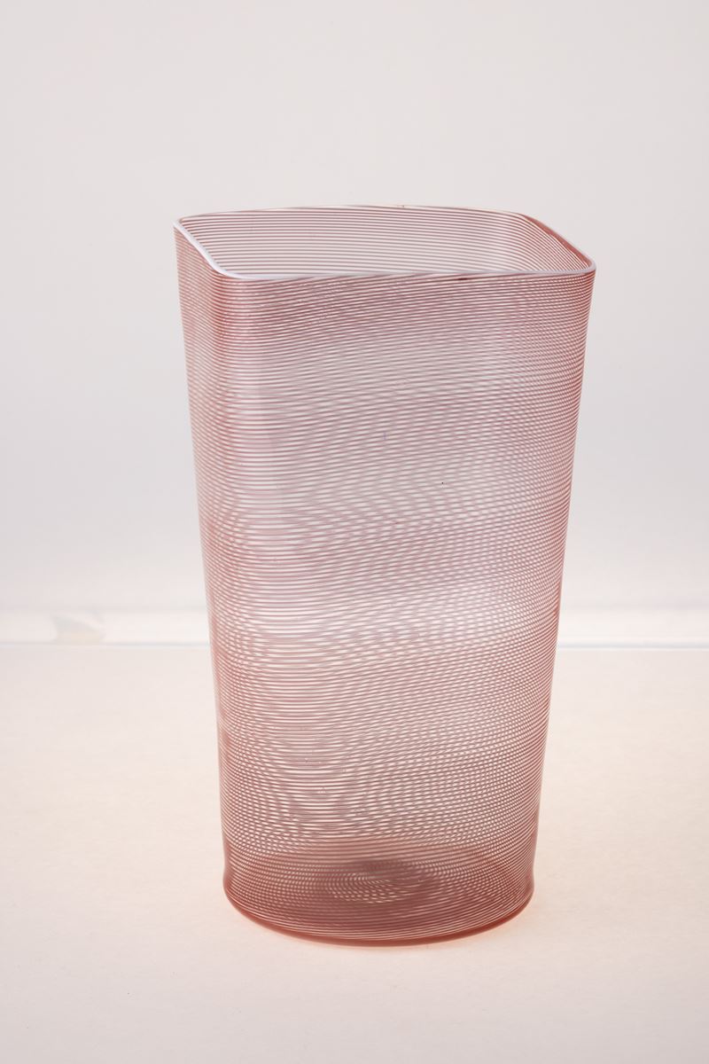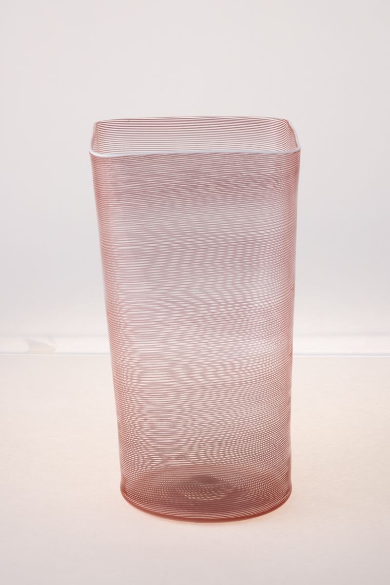 Vaso troncoconico con bocca quadrata in vetro soffiato con decoro di filigrana ciclamino e filo lattimo.