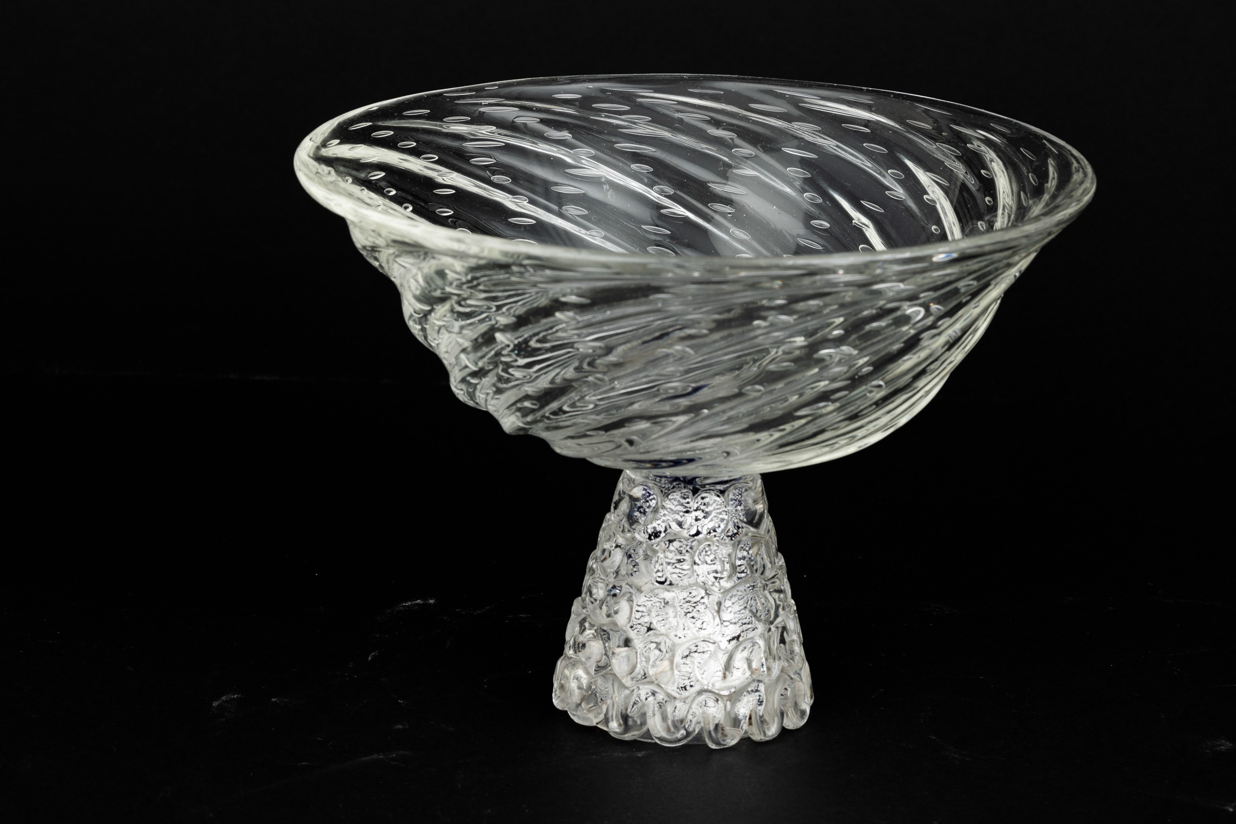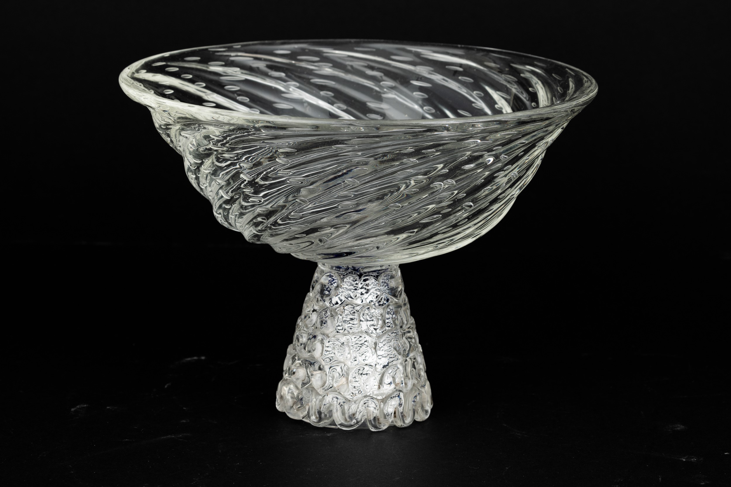 Alzata in vetro soffiato a costolature ritorte su basamento in vetro pesante a Lenti con sommersione di foglia argento.
