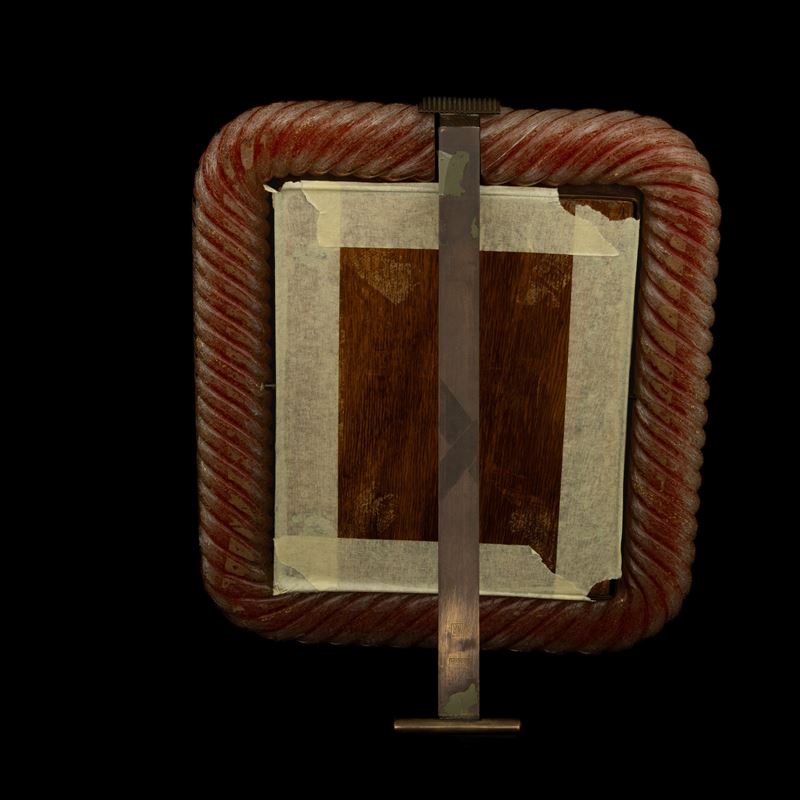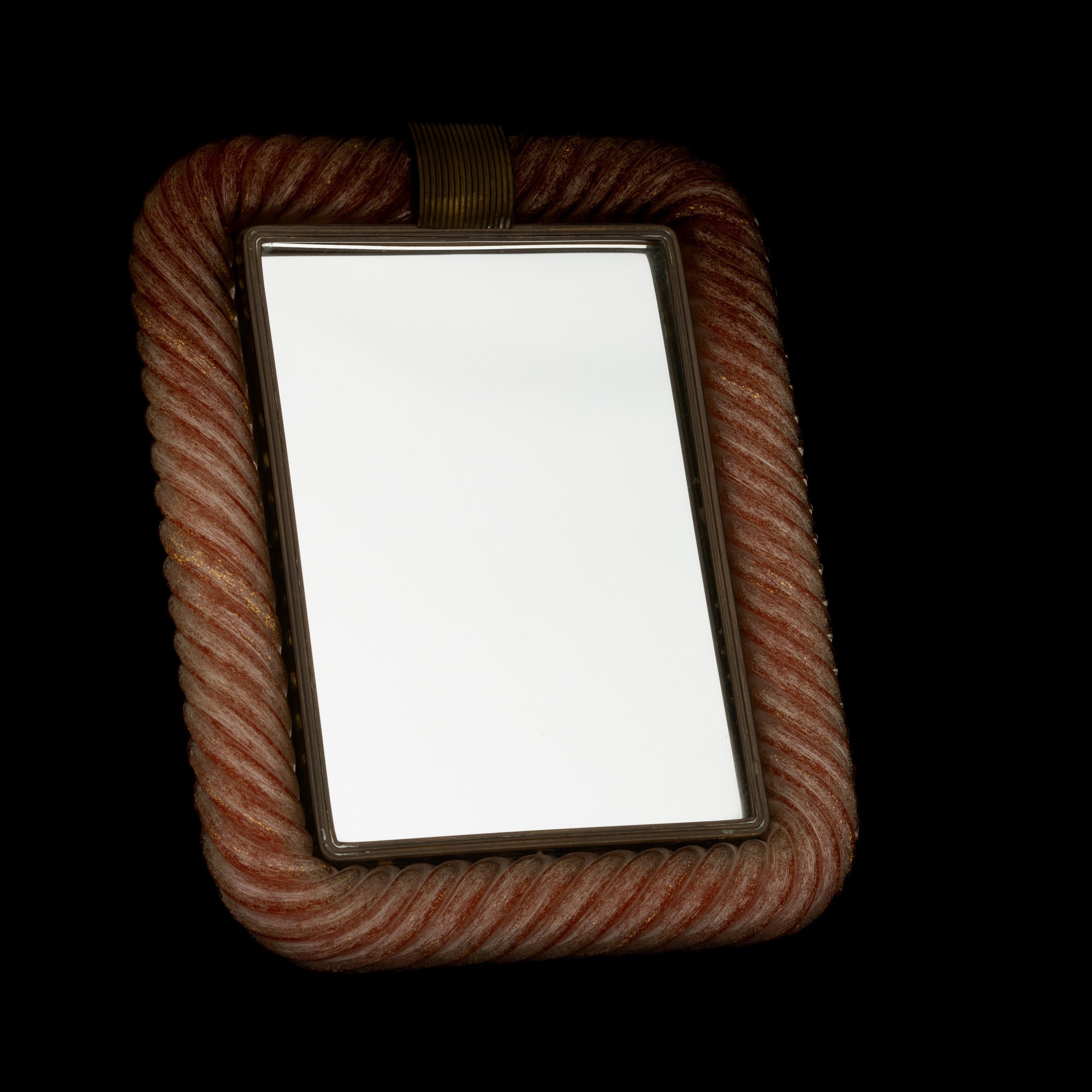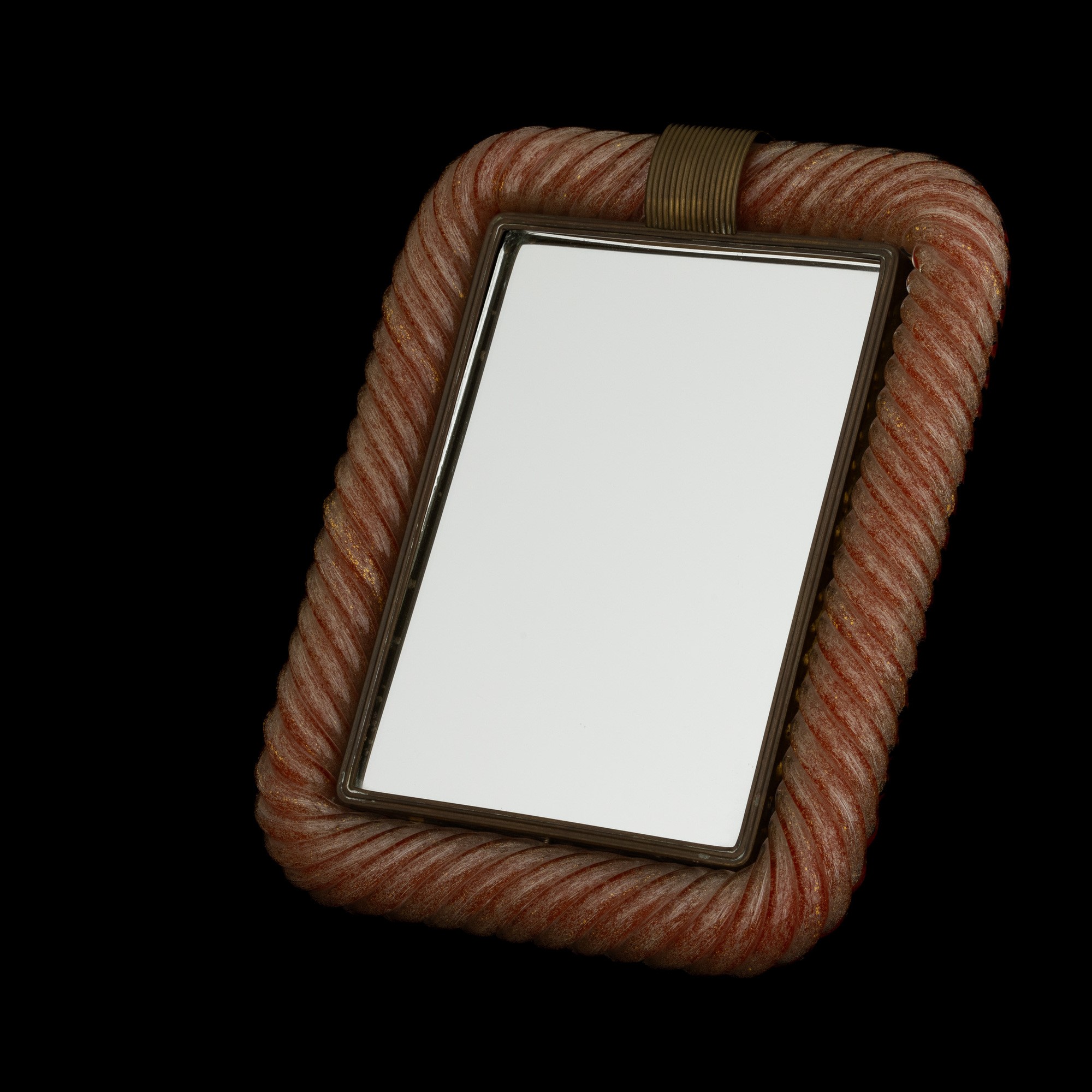 Raro portaritratti in ottone con cornice in vetro a torciglione rosso aranciato e decoro di bollicine e foglia oro sommersa.
