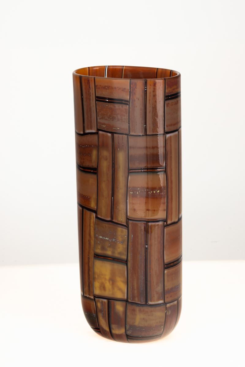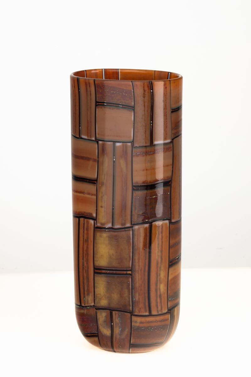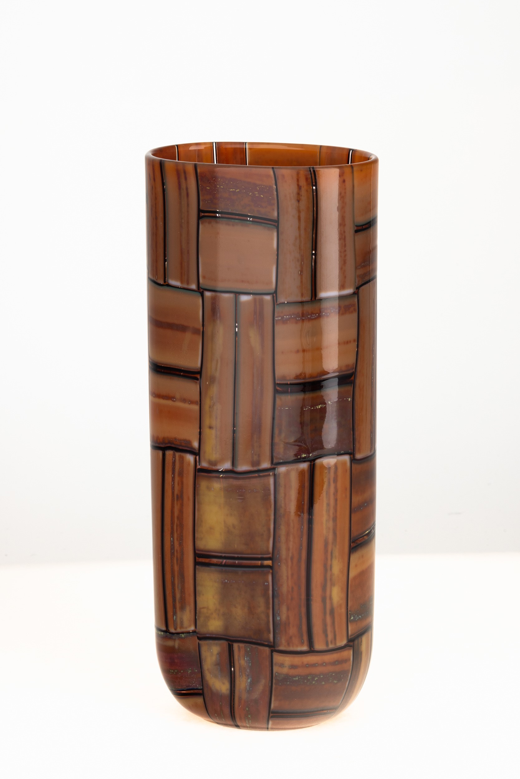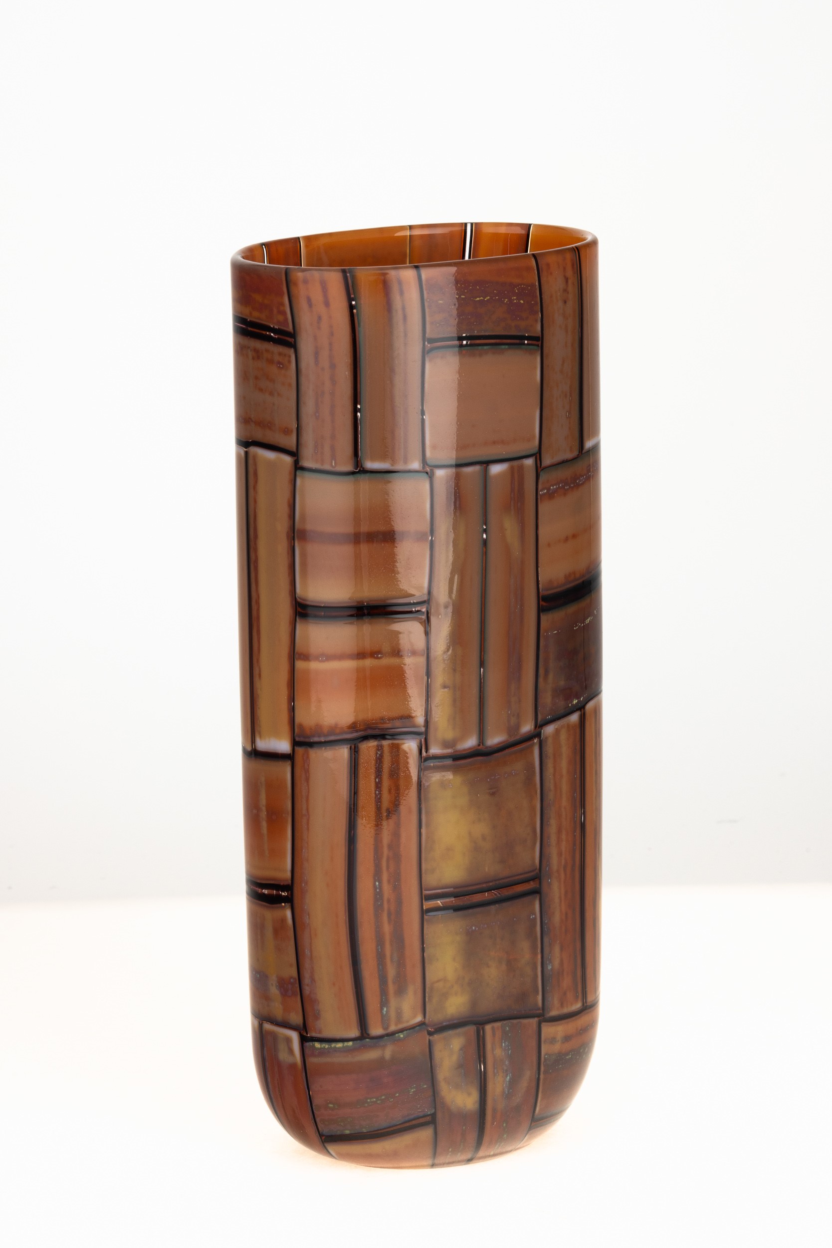 Vaso cilindrico a sezione ovale serie Tessere Ambra in vetro soffiato con decoro di murrine realizzate a canne opache ocra con filetti ciclamino.