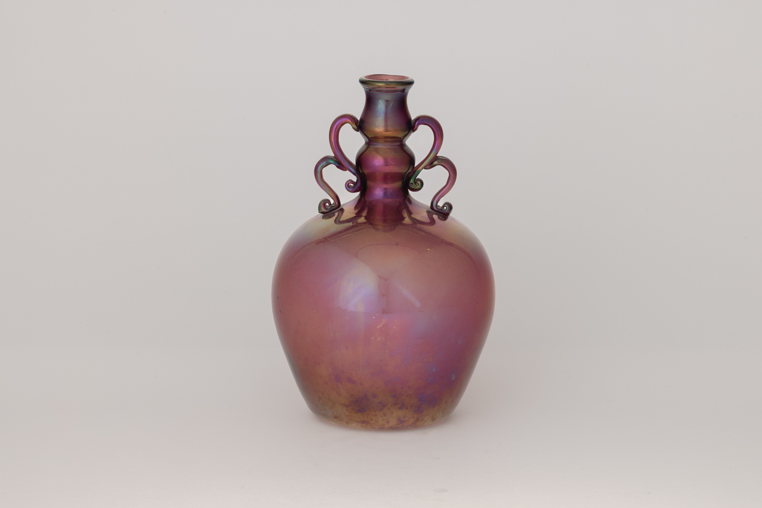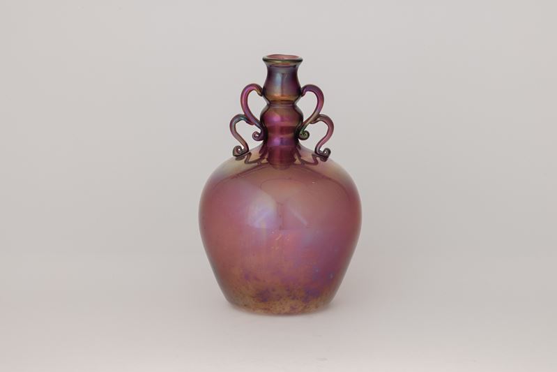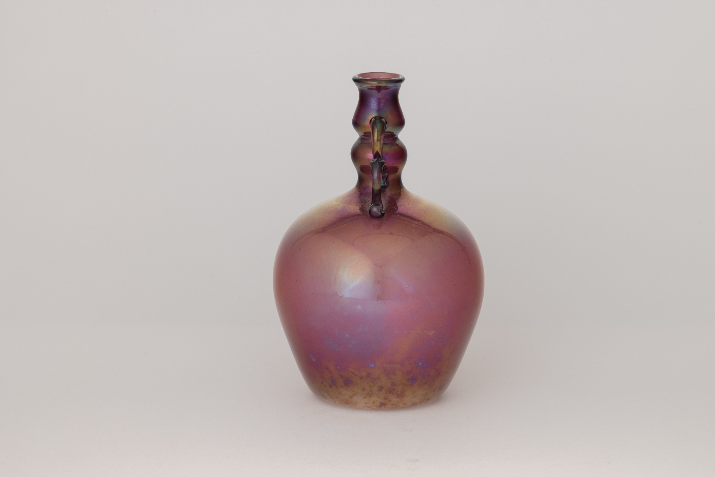 Raro vaso a bottiglia in vetro soffiato ametista con superficie interamente iridata e doppie anse applicate.