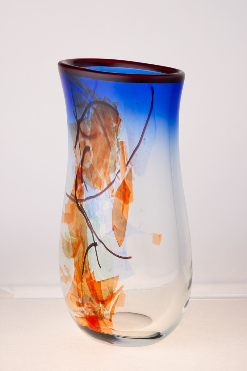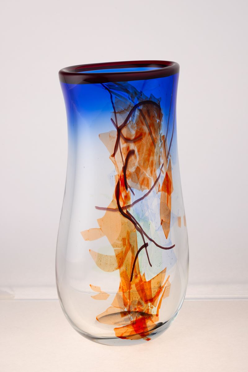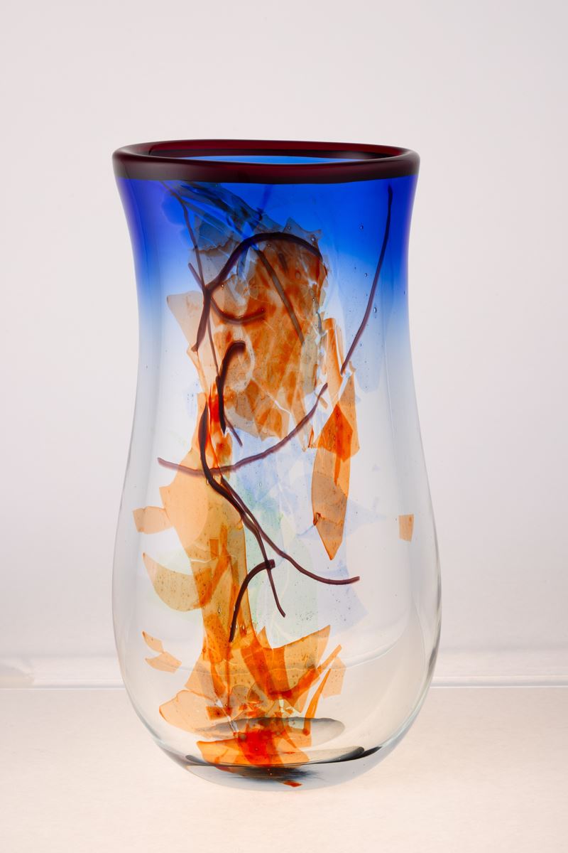 Vaso a balaustro a sezione ovale in vetro soffiato con decoro astratto di canne e macchie policrome sommerse.