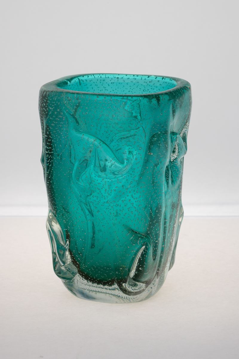 Vaso di forma troncopiramidale in vetro lavorato a caldo con rilievi e bollicine sommerse.