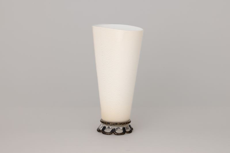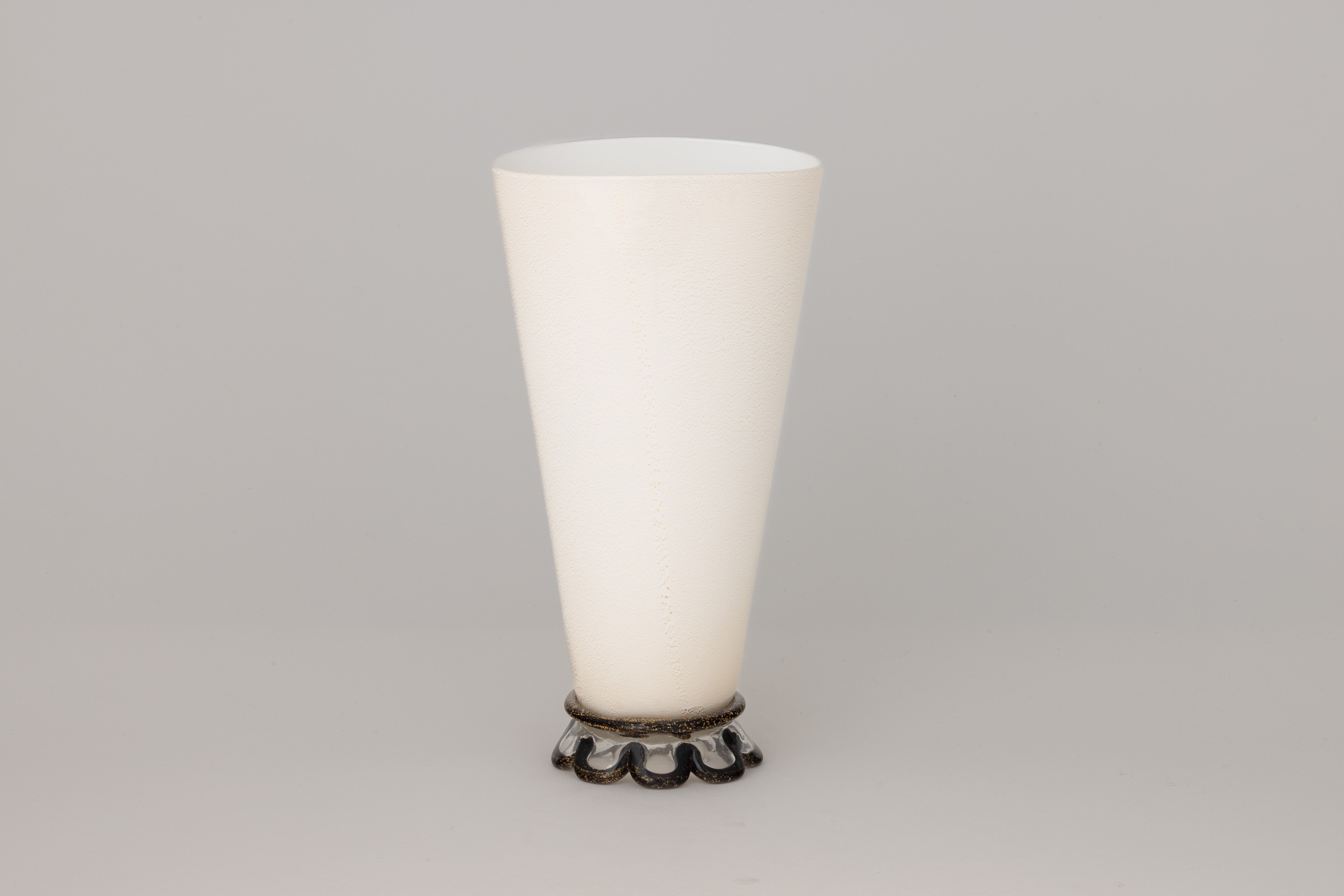 Raro vaso di forma troncoconica a sezione ovale in vetro lattimo con foglia oro. Piede a corolla con fili applicati in pasta vitrea nera e foglia oro.