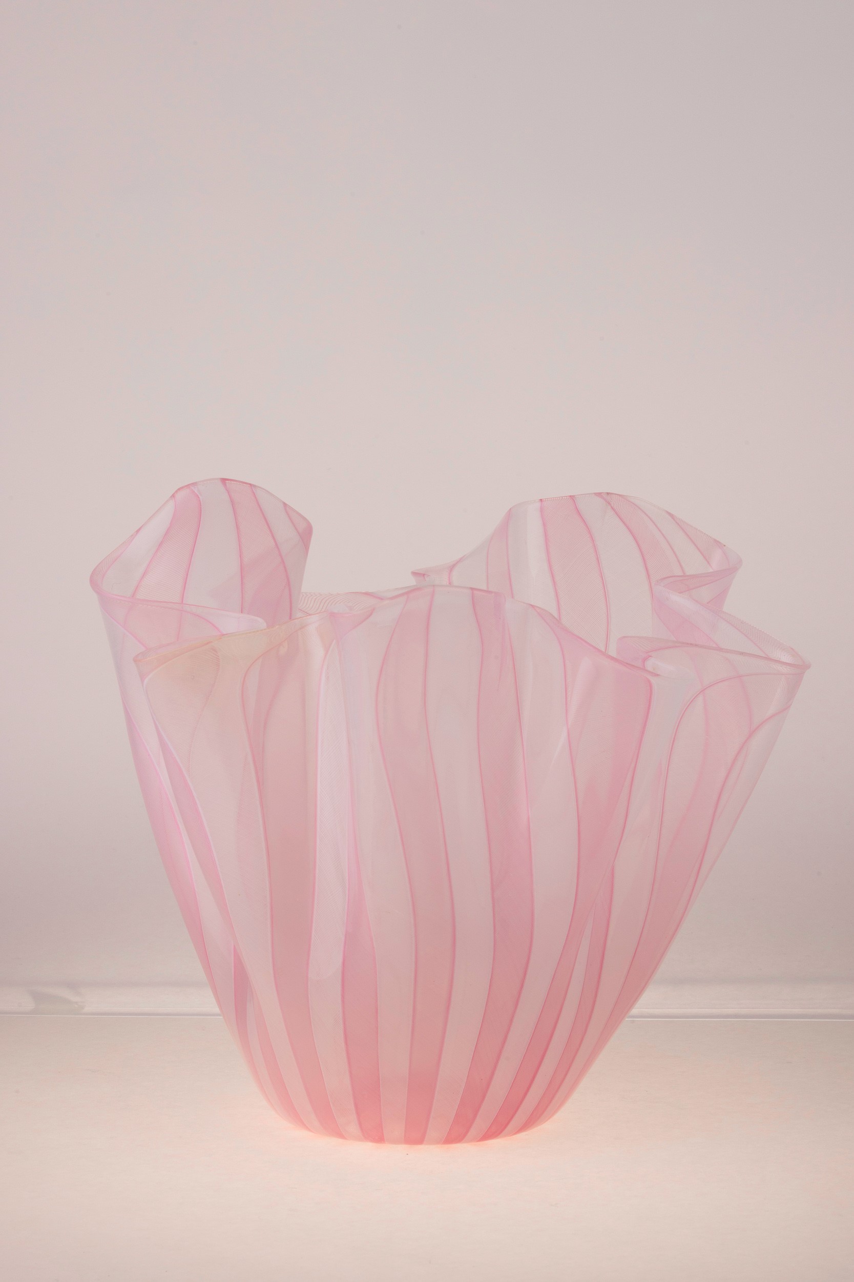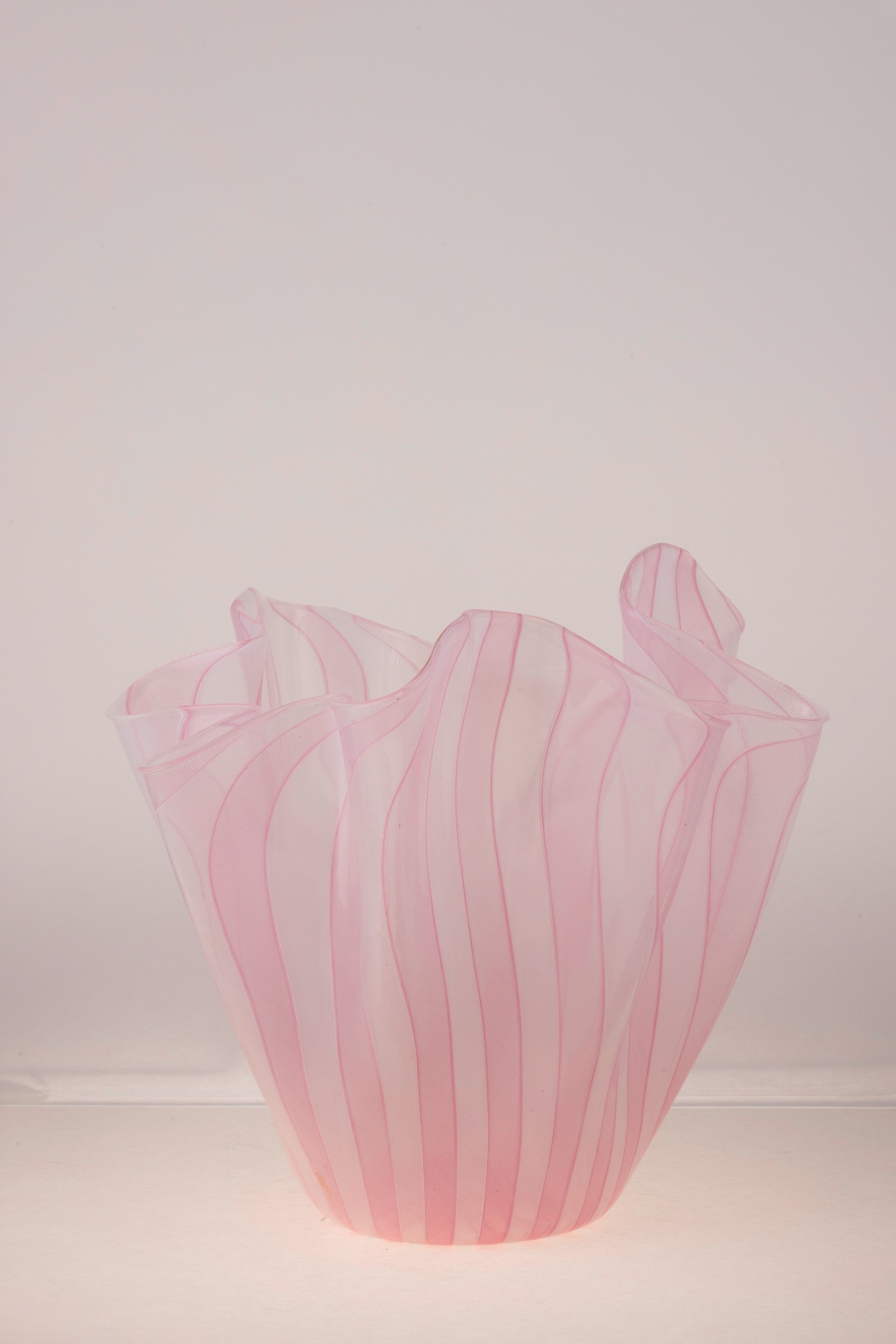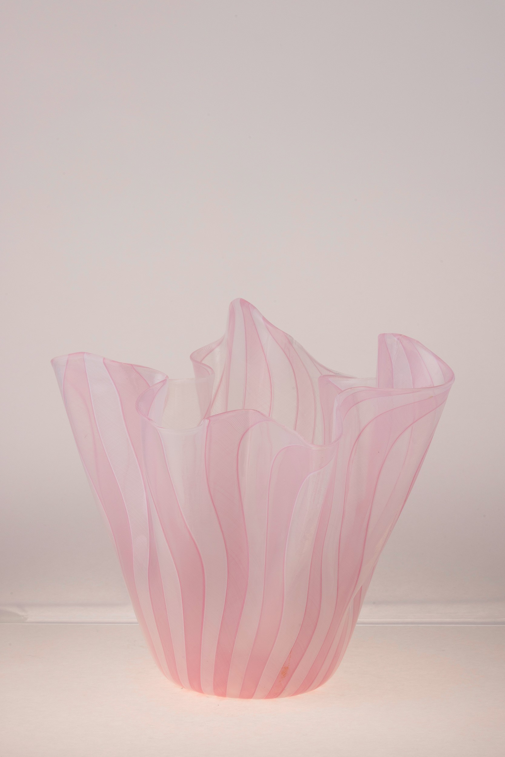 Vaso Fazzoletto in vetro soffiato con decoro di canne a reticello rosa lattimo.