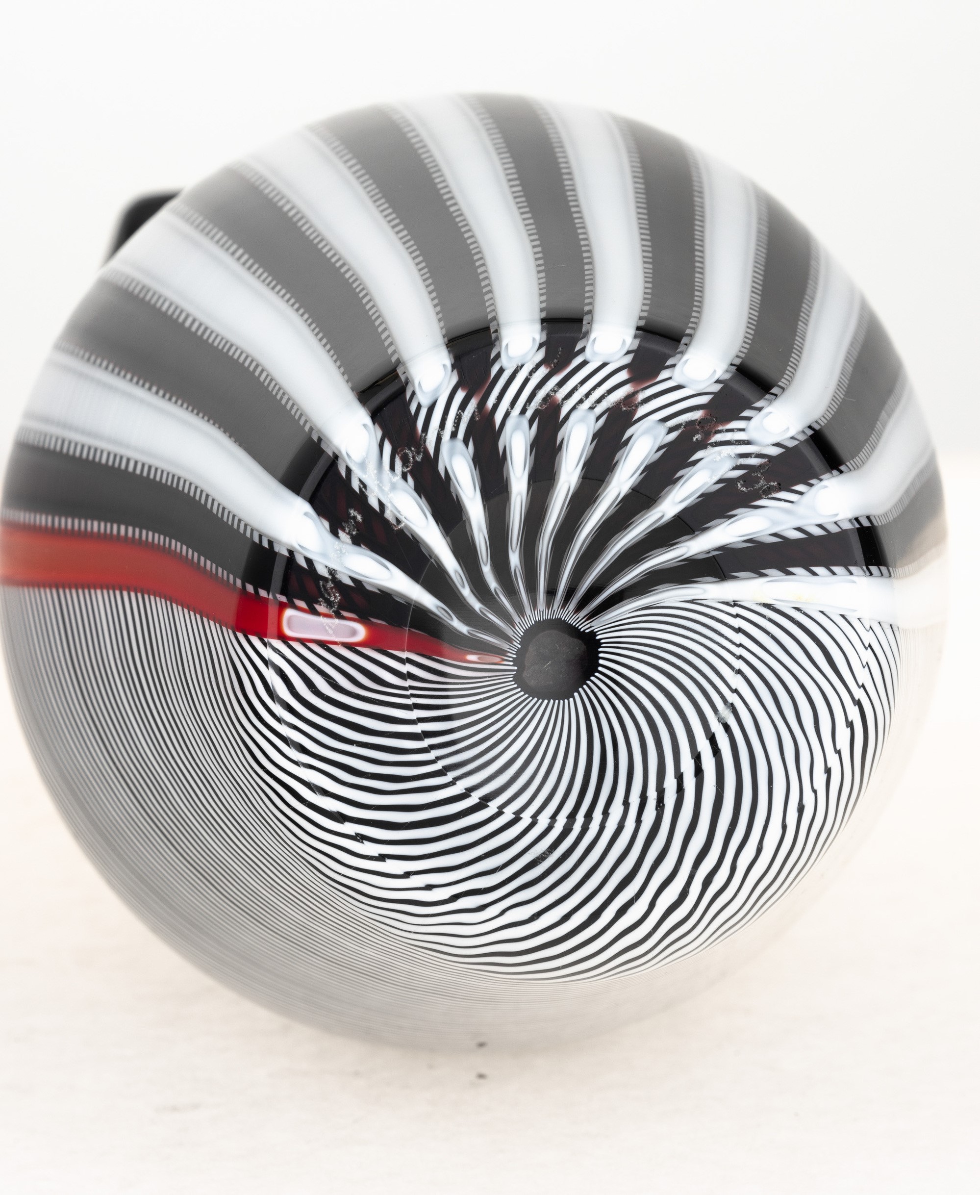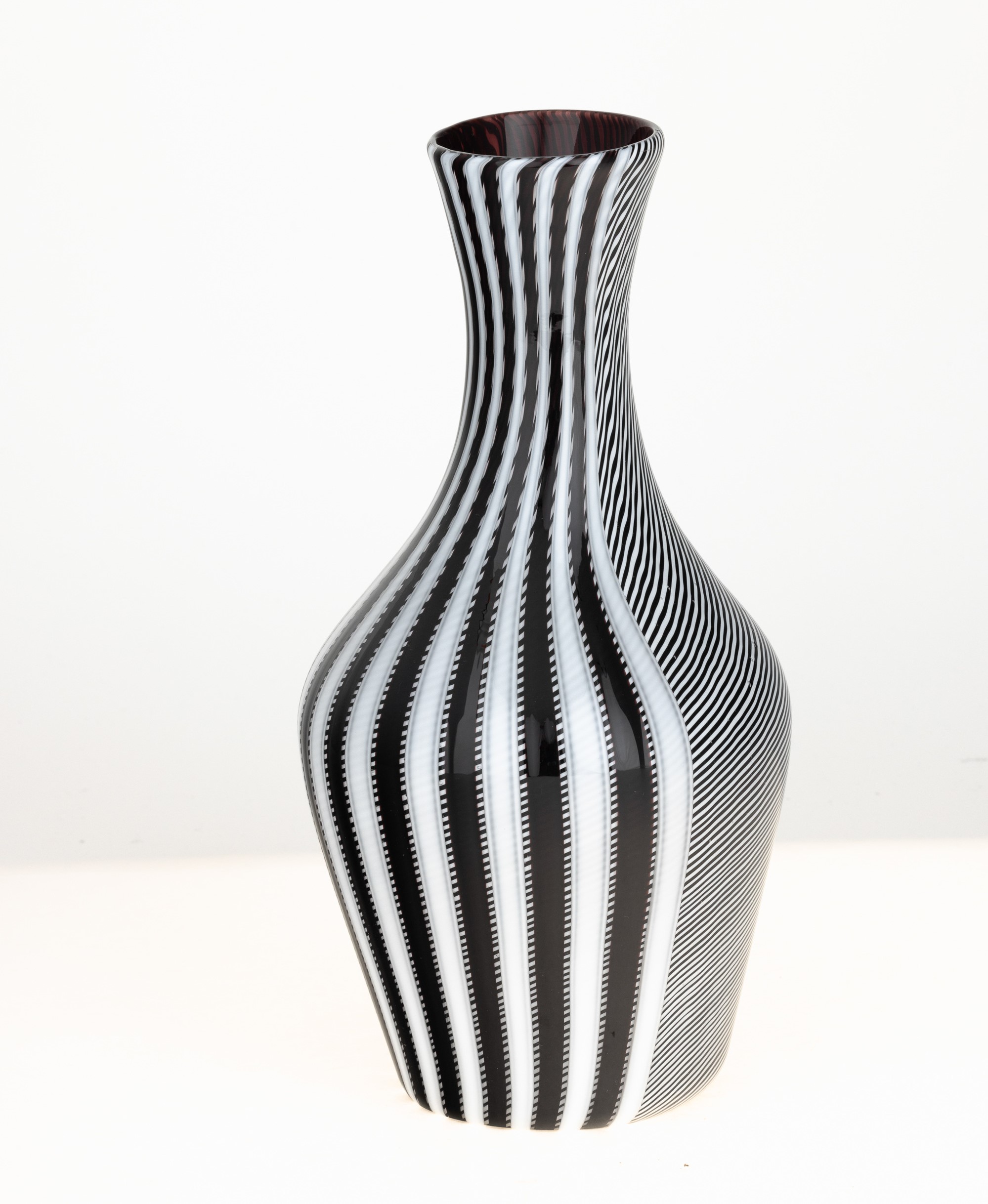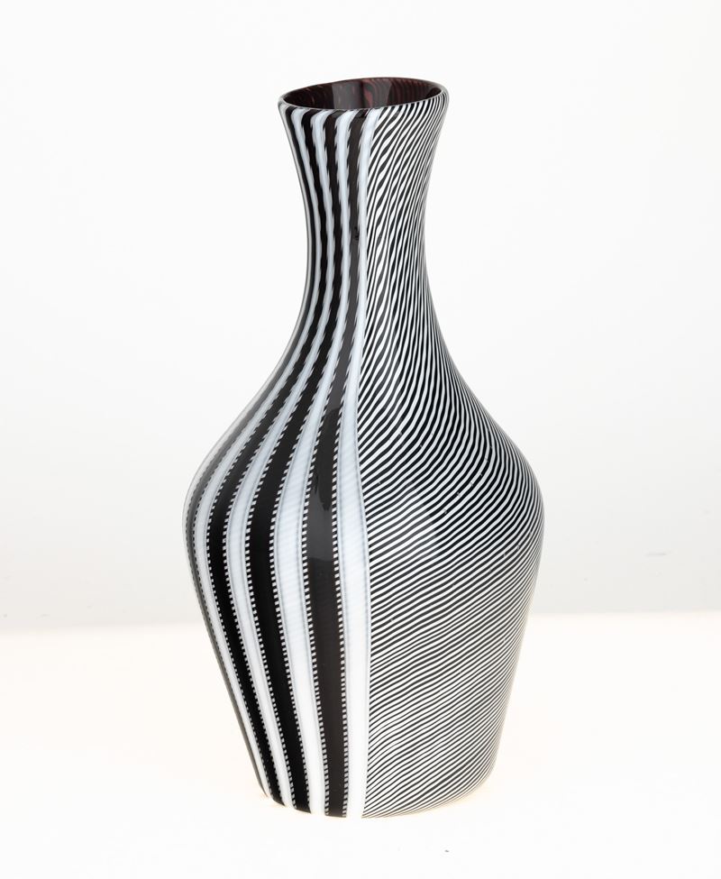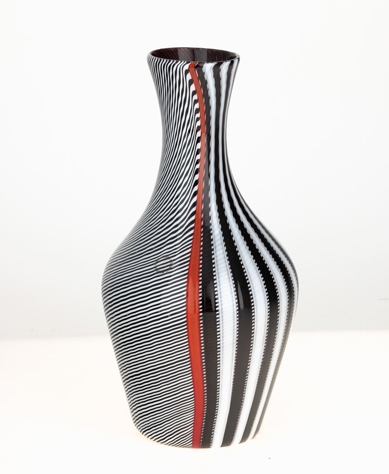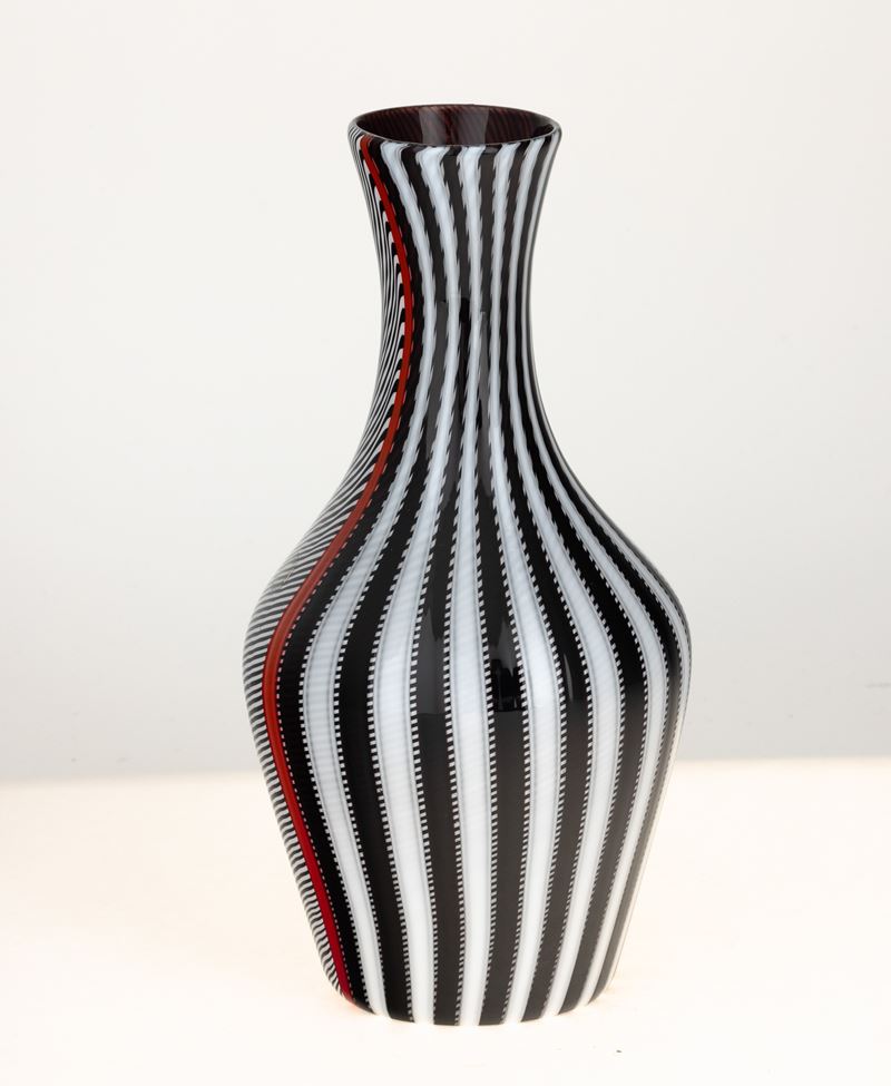 Vaso Smoking a bottiglia in vetro soffiato con decoro di canne incrociate lattimo, nere e rosse.