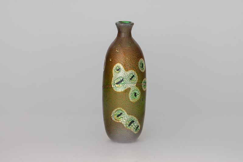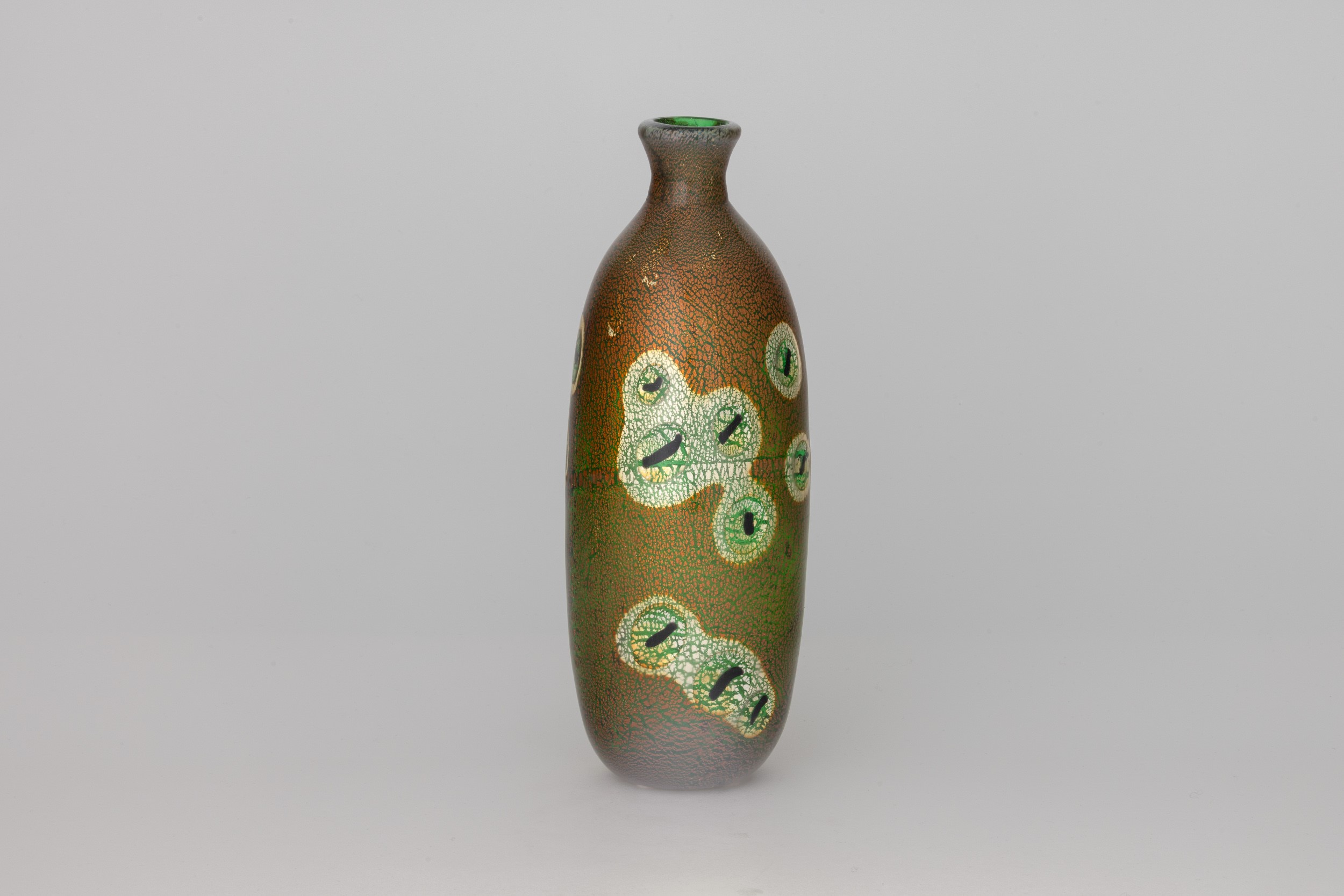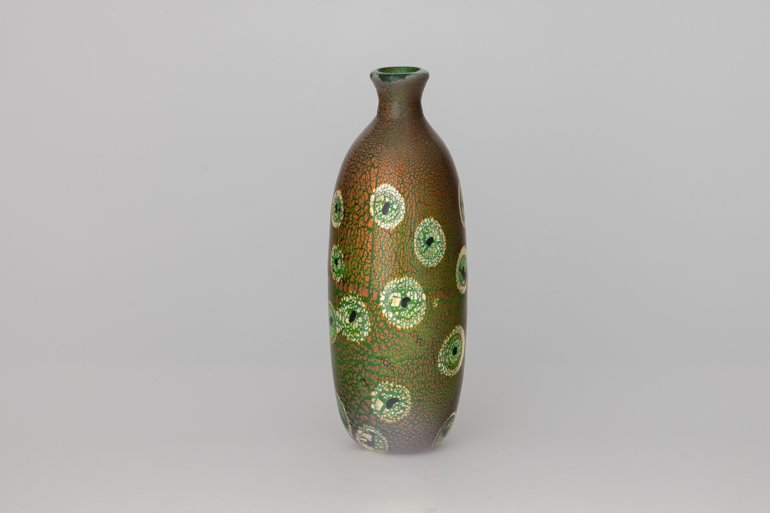 Vaso a uovo con piccolo collo in vetro soffiato a sommersioni policrome con decoro di grandi murrine e foglia argento.