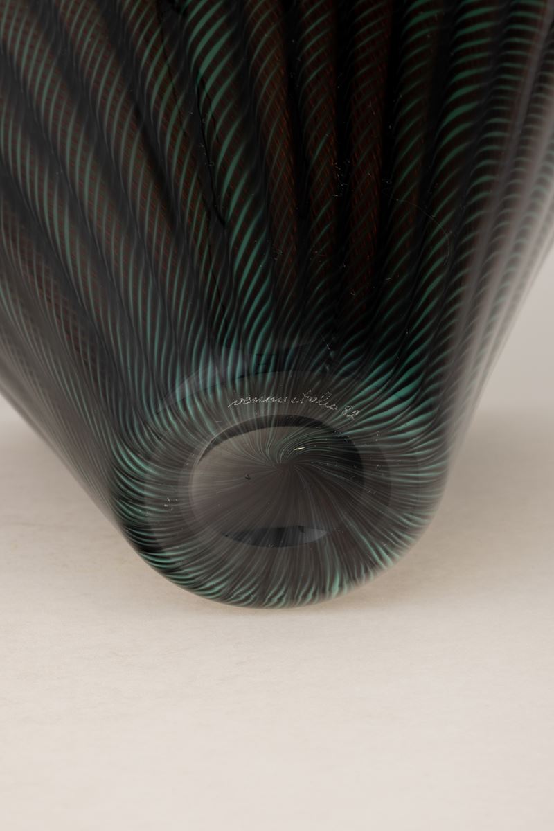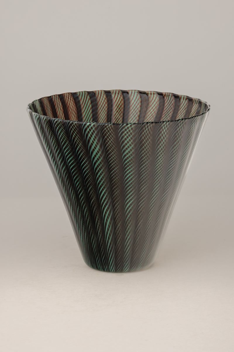 Vaso troncoconico serie Tweed in vetro soffiato con decoro di canne policrome ritorte alternate.