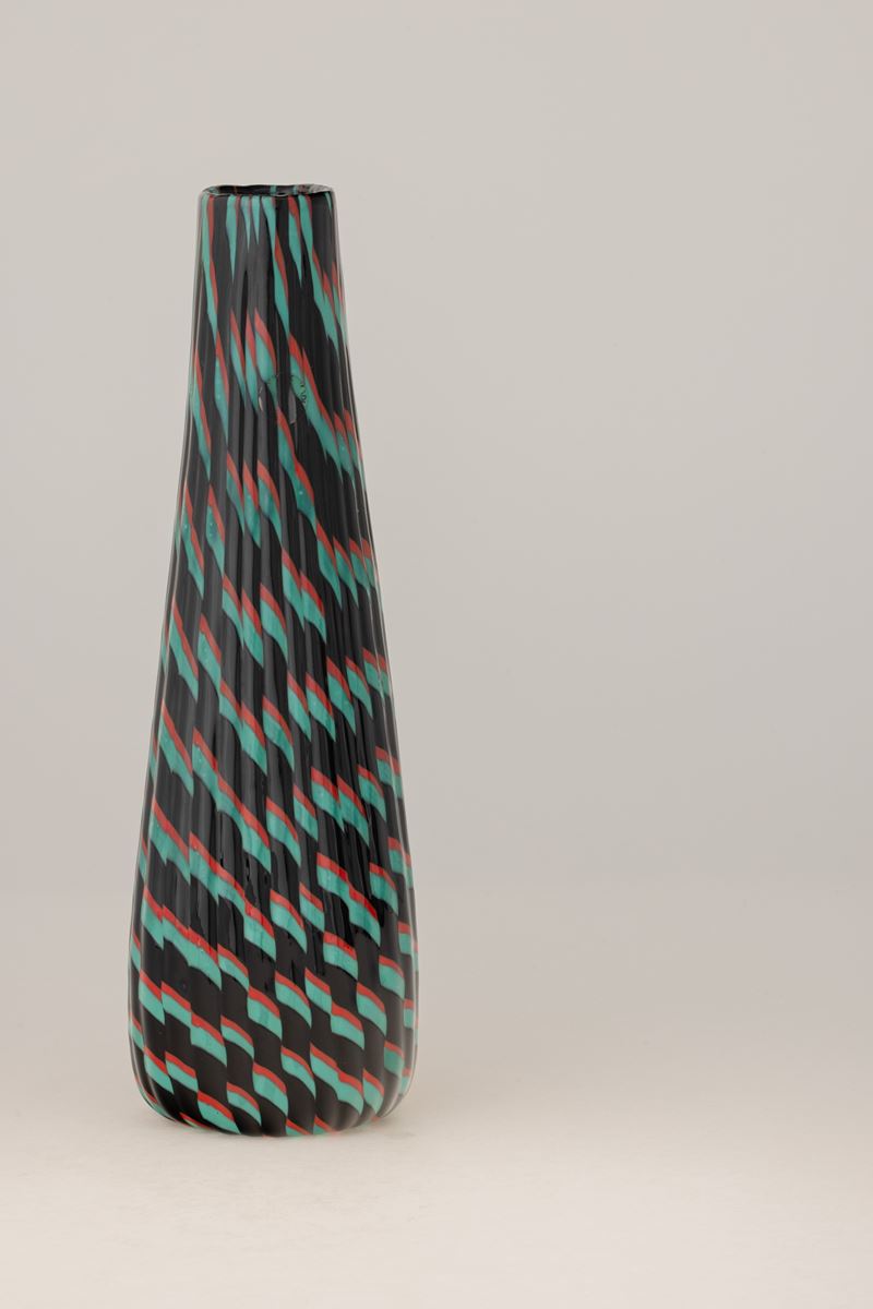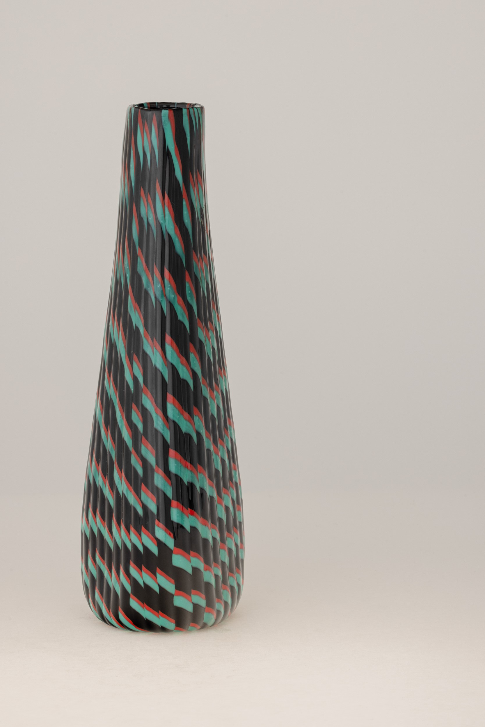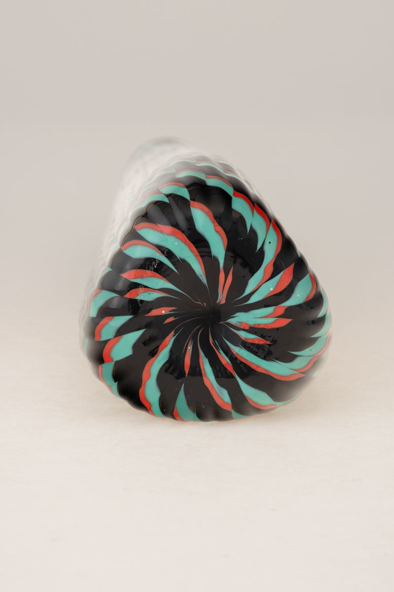 Vaso serie Calabash di forma troncopiramidale a sezione triangolare in vetro soffiato con decoro di canne policrome.