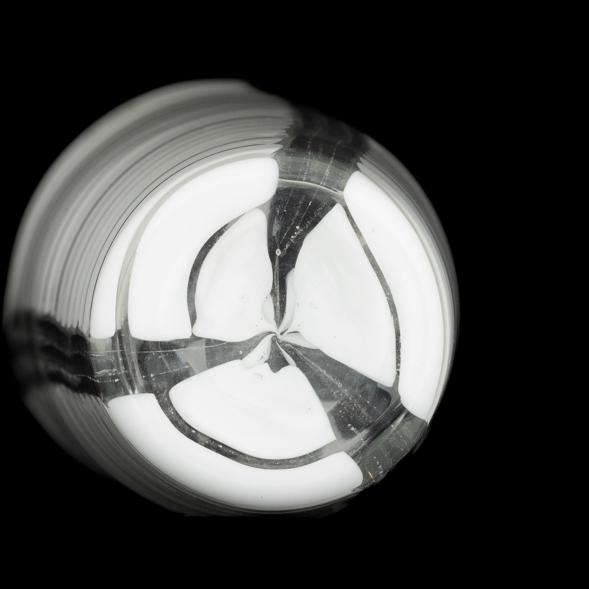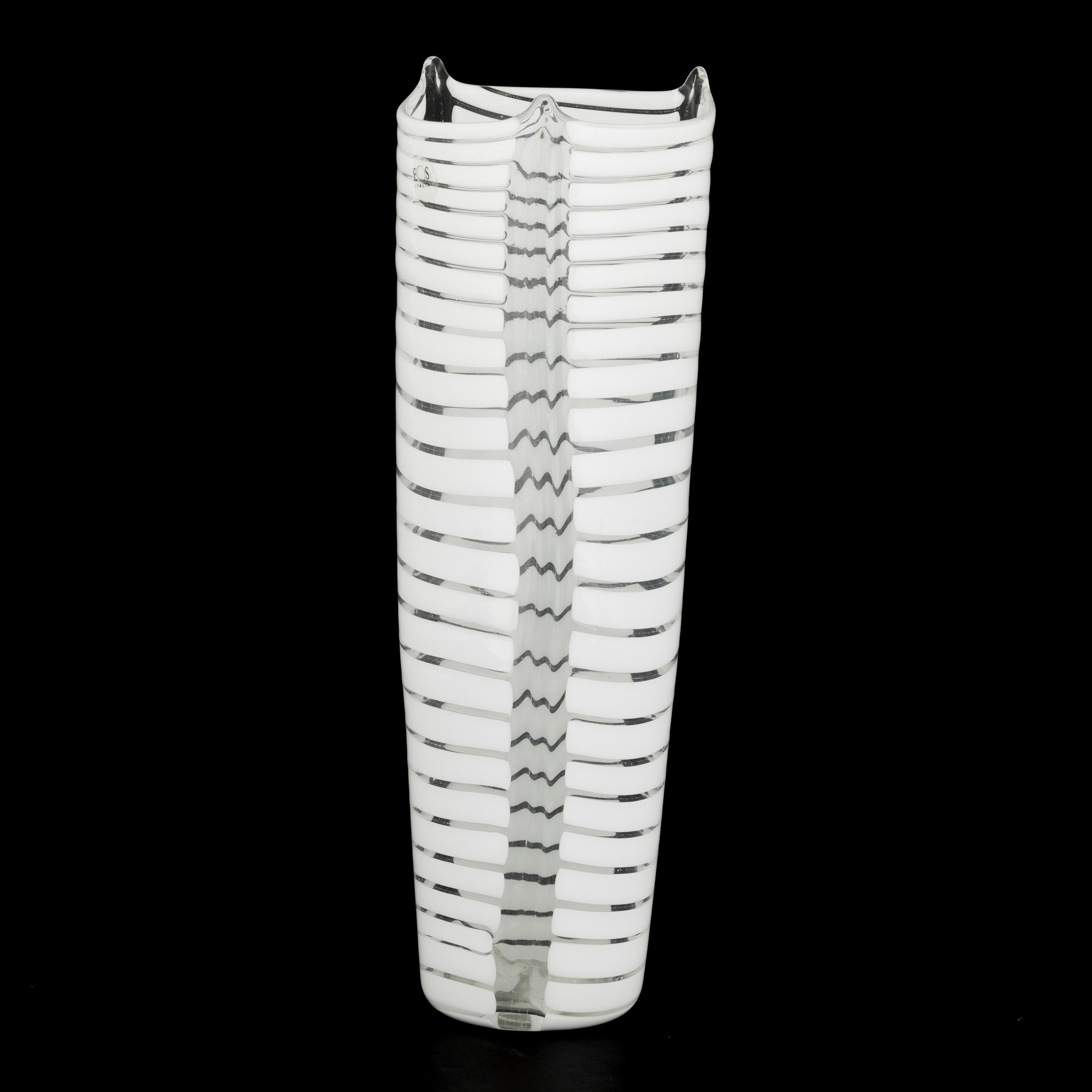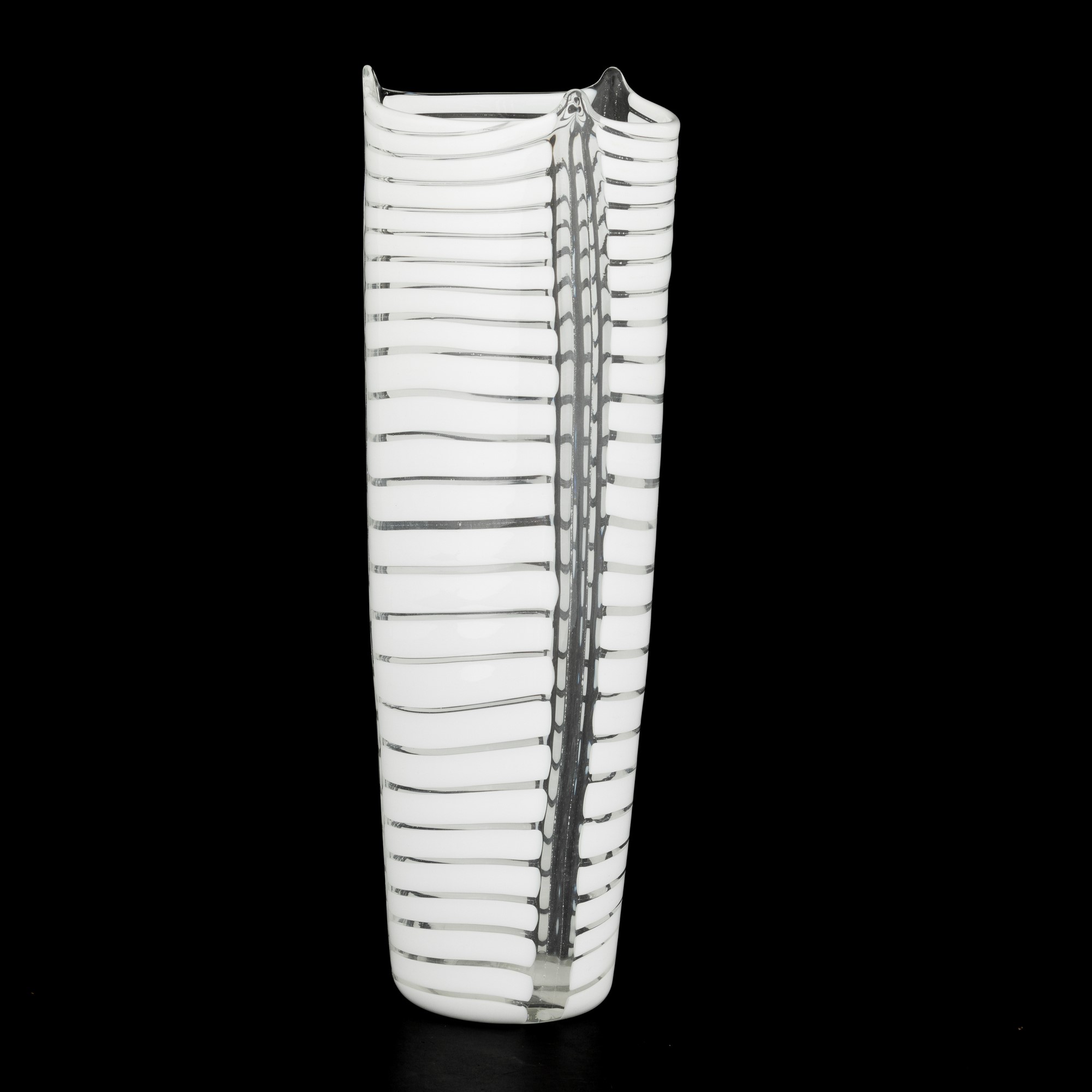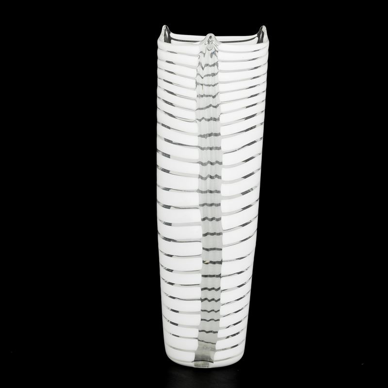 Vaso cilindrico in vetro soffiato serie Angeli con decoro di canne lattimo e cristallo.