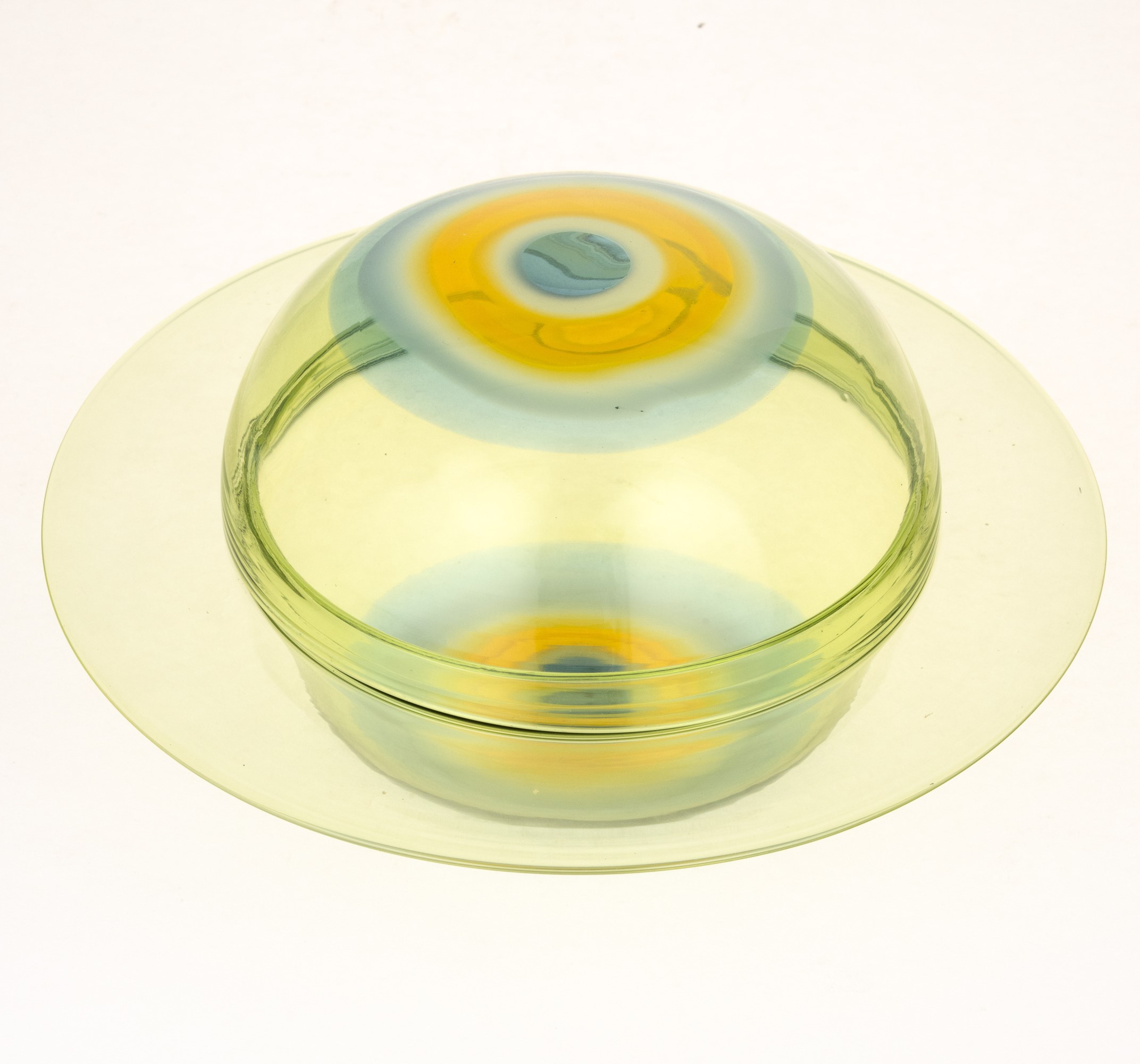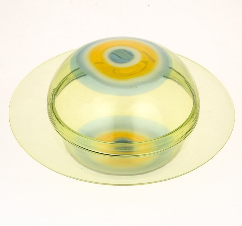 Vaso Saturno con coperchio in vetro soffiato verdino con decoro di grandi murrine policrome concentriche.