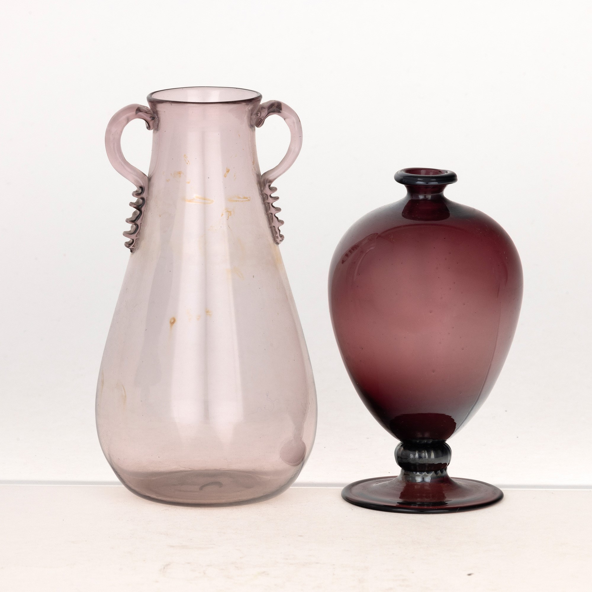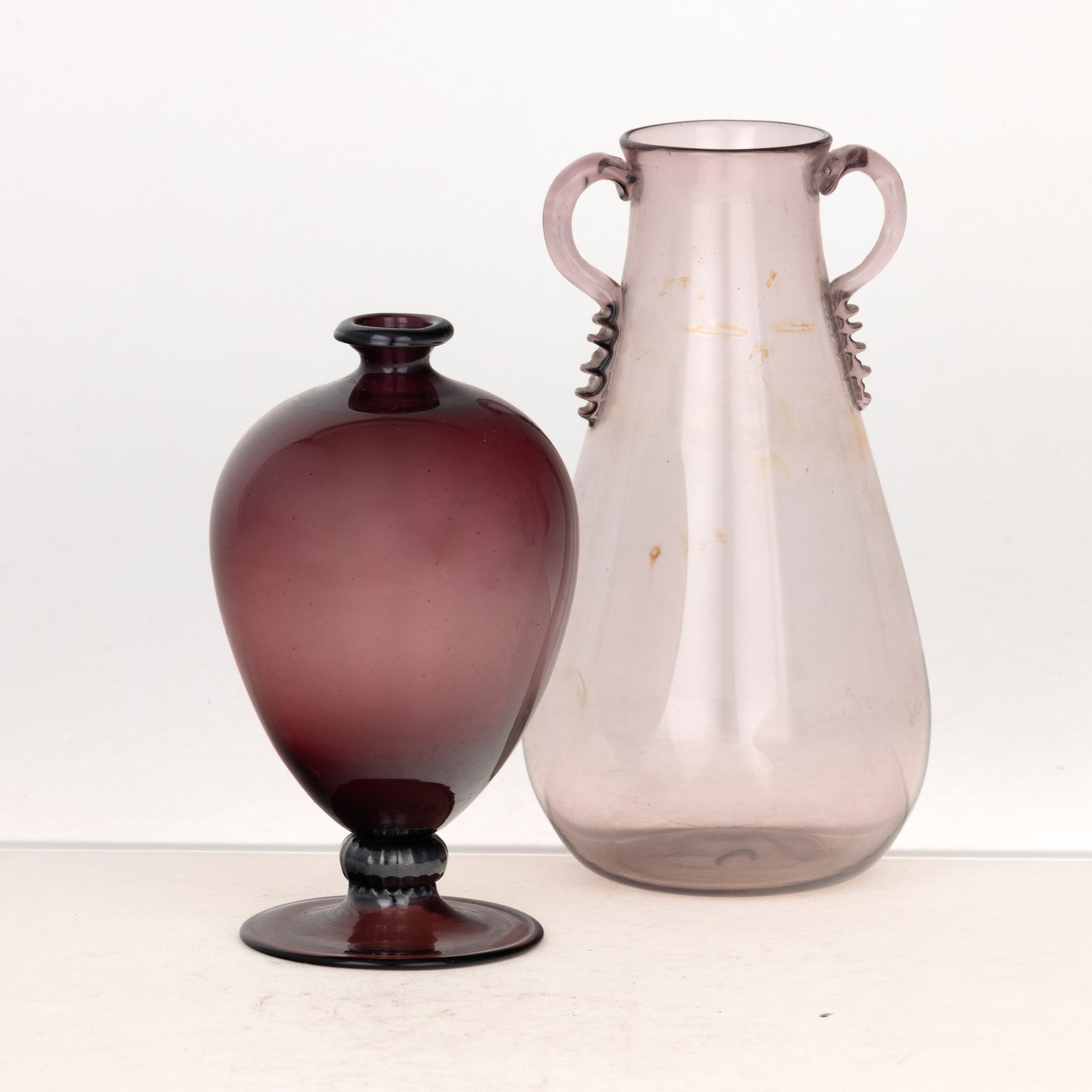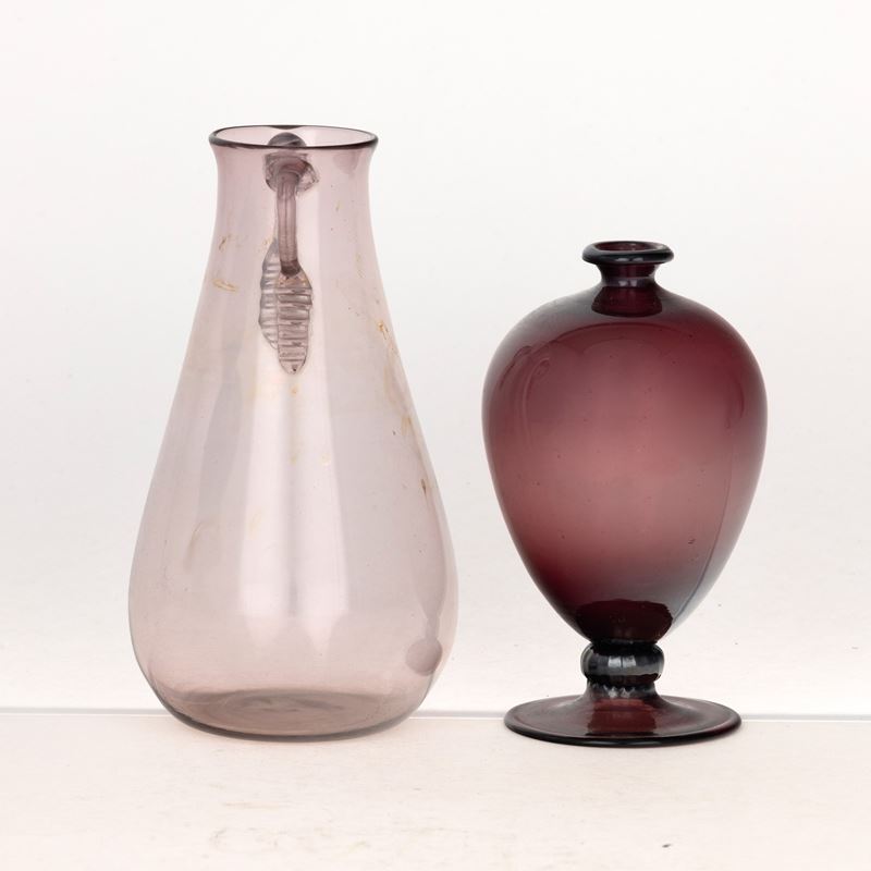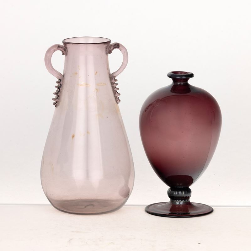 Lotto formato da piccolo vaso Veronese in vetro soffiato ametista e un altro vaso color ciclamino con anse applicate.